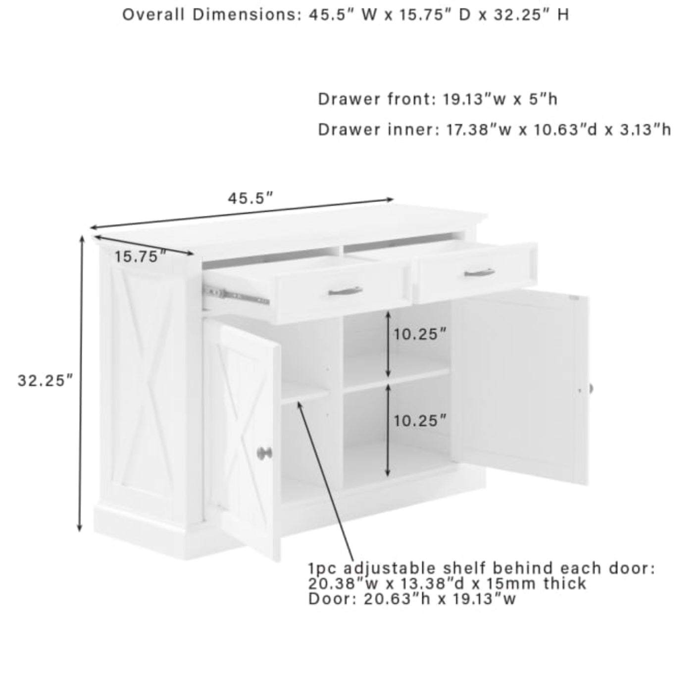 Delivering modern farmhouse charm to your home, the Clifton Sideboard features a classic x motif reminiscent of a barn door. The sideboard’s two full-extension drawers and two large cabinets with adjustable shelving offer ample storage for any room. Use the Clifton Sideboard as a dining room buffet, credenza or media stand. This sideboard is full of stylish possibilities.