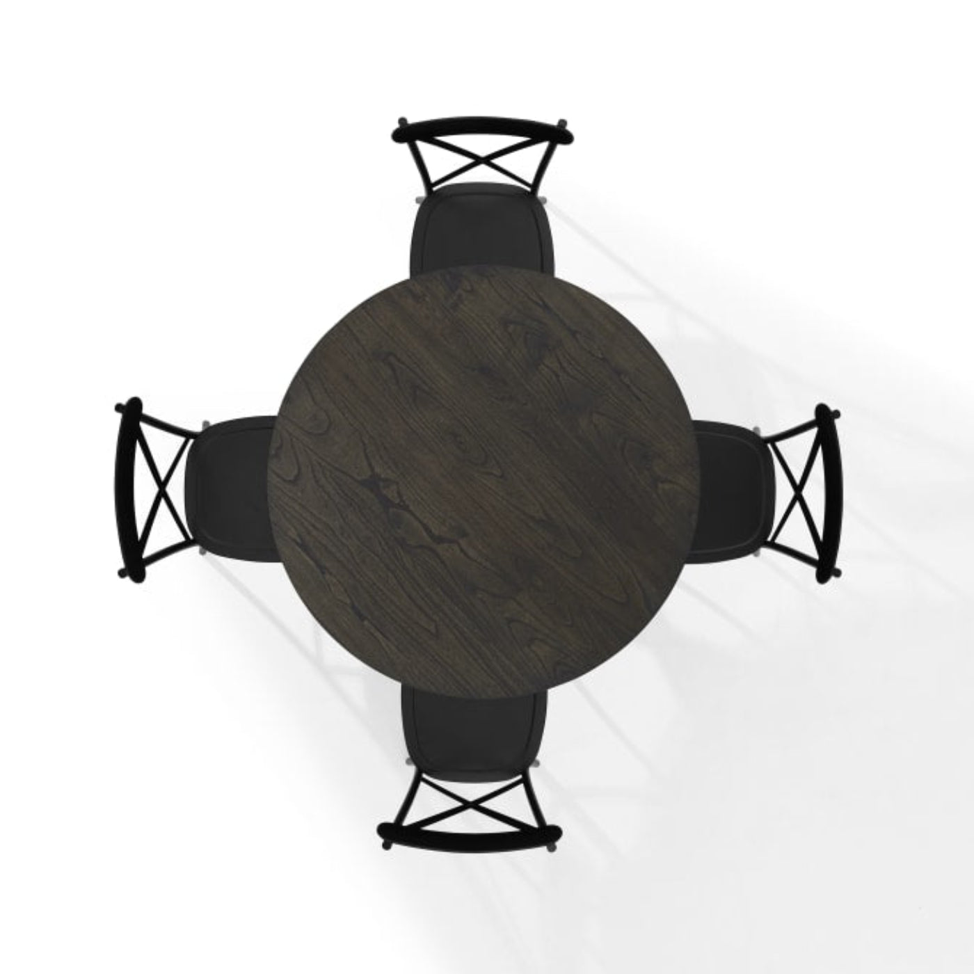 Bring modern farmhouse style to family gatherings with the Hayden Round Dining Set with Camille Chairs. Blending rustic wood and sturdy steel, this set features a round pedestal table surrounded by four all-metal x-back dining chairs. Beautifully crafted with intersecting legs, the table's pedestal base makes the Hayden 5pc Round Dining Set a timeless centerpiece for your dining room.