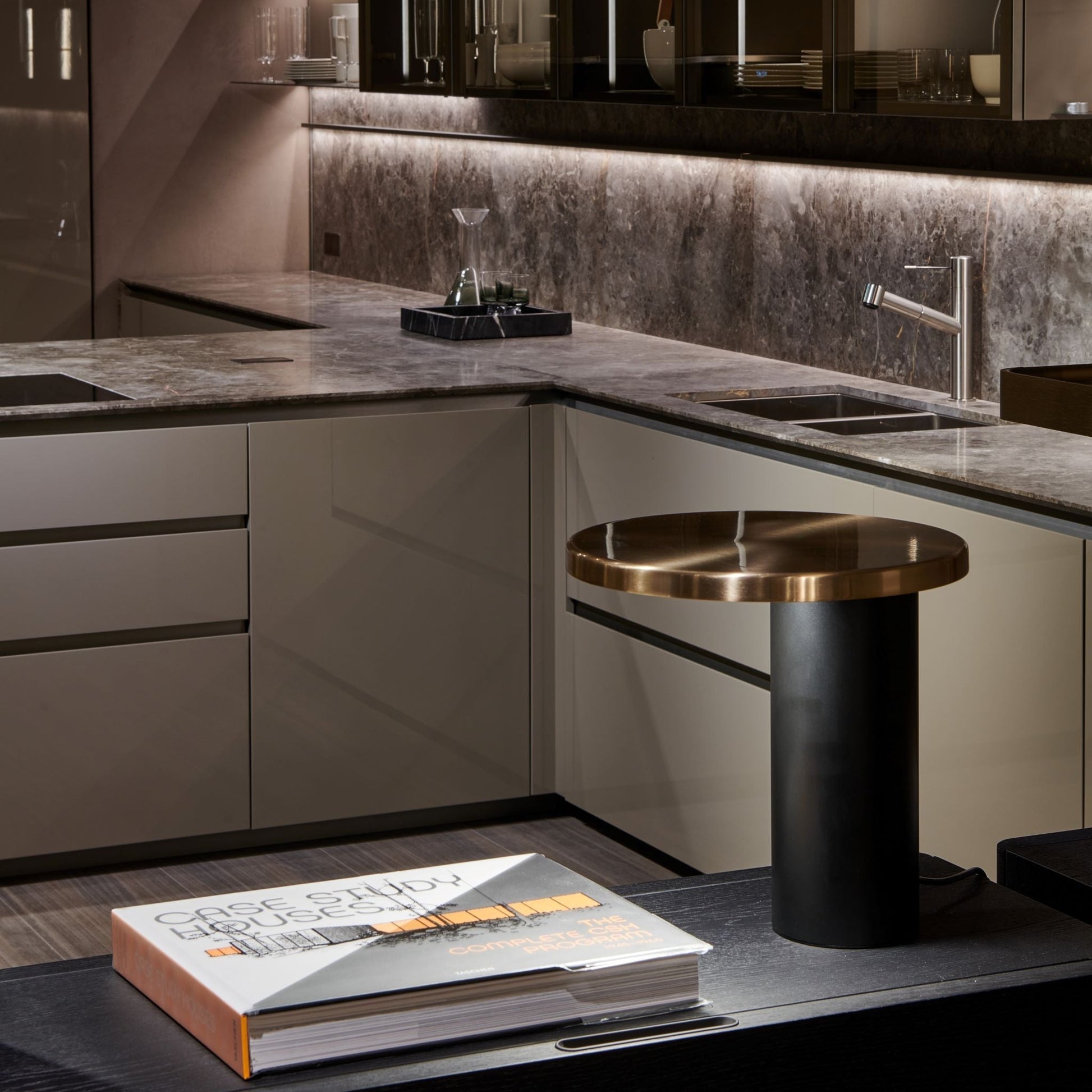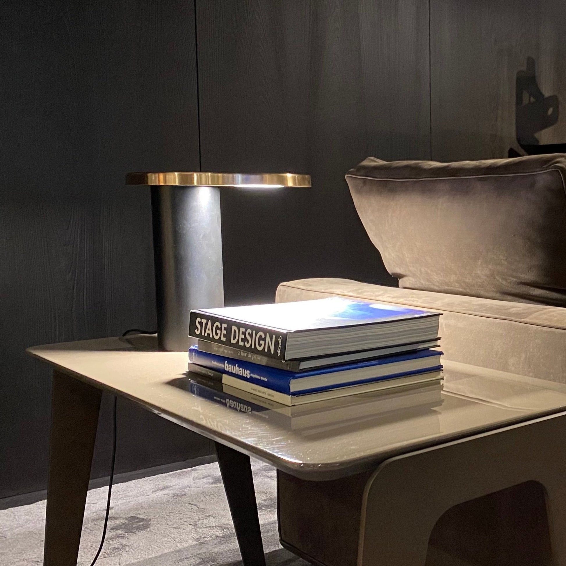 In addition to its striking design, the Cylinda Table Lamp offers versatile finishes. Available in a sleek monochrome anthracite version or a two-tone style, it features a brushed gold disc atop an anthracite base. This combination enhances the lamp’s refined quality, highlighting the elegant lines and geometric shapes. Whether in a modern or classic interior, this lamp adds a sophisticated touch, showcasing Oluce's commitment to craftsmanship and understated luxury. Its quiet presence makes a bold statement in any space.
