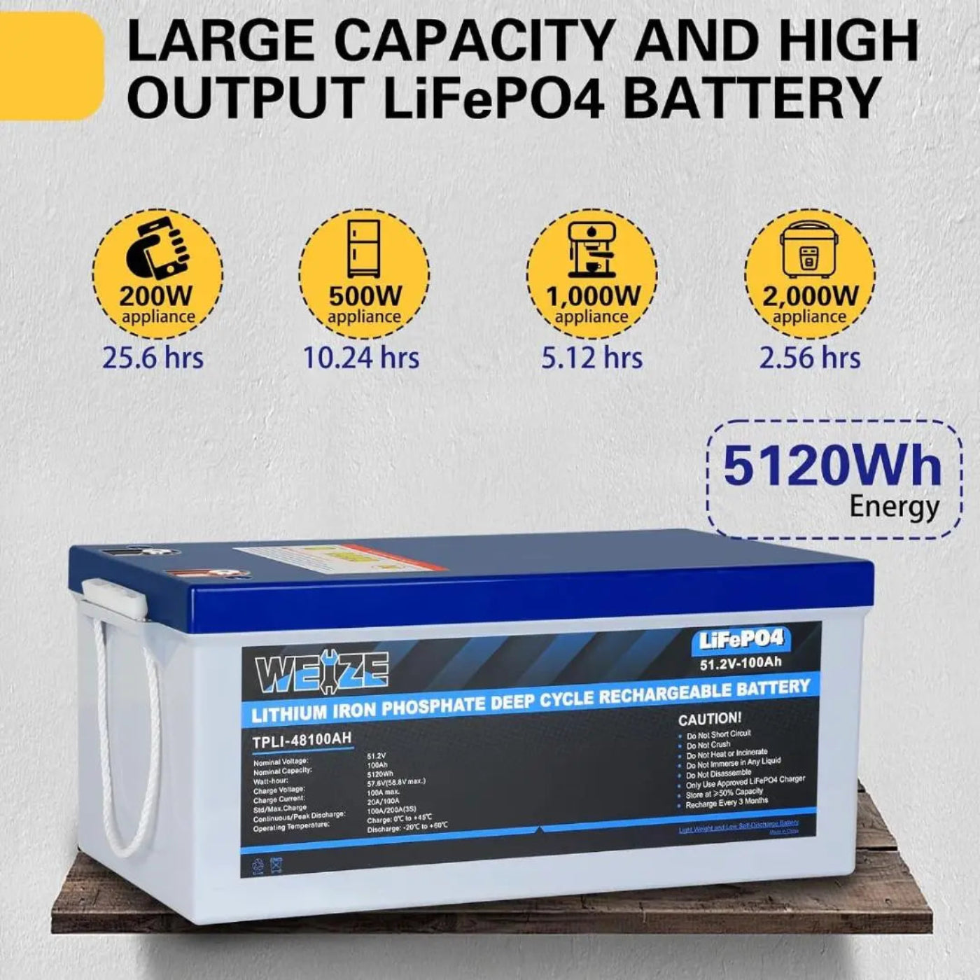Q: What is the WEIZE 51.2V 100Ah LiFePO4 Lithium Battery?