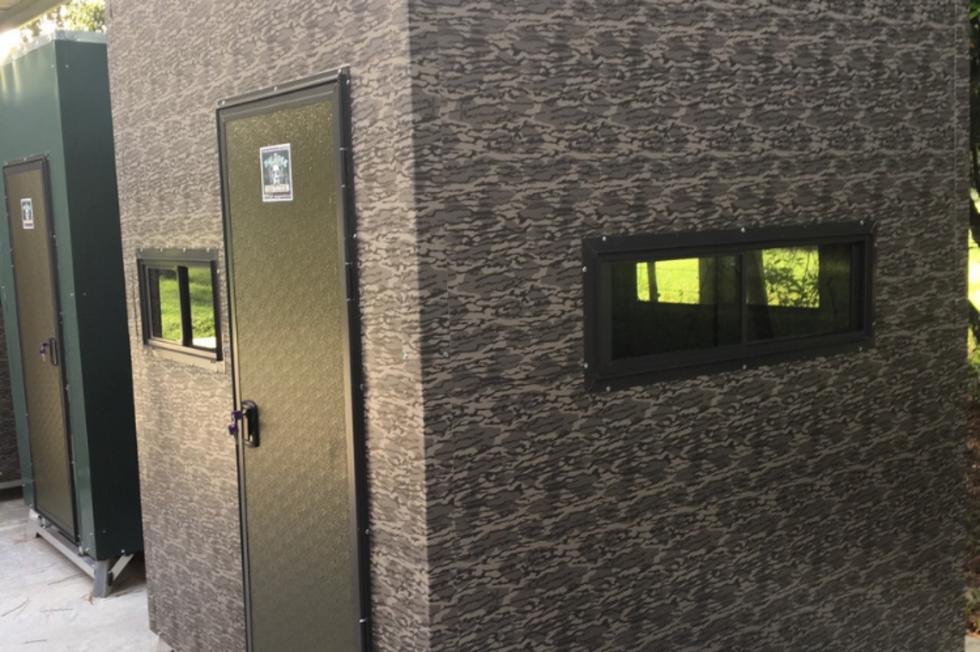 Premium Insulation & Features - deer blinds are framed and the decking and insulation is installed, we then add great features like insulated and functional windows and door. We top things off with shelf rests.