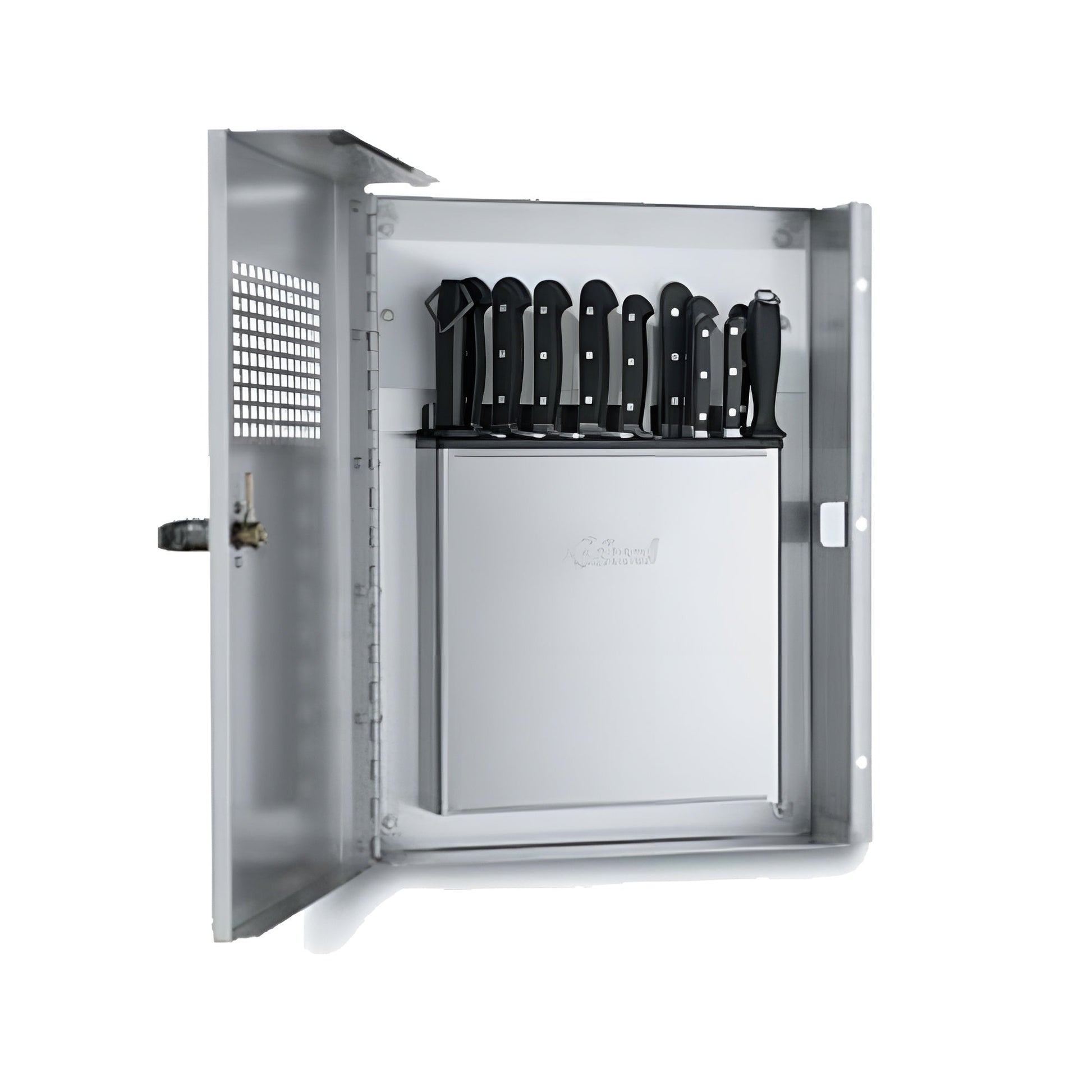 The Edlund KLC994 is a knife cabinet with keyed locking handle and 3 integral padlock holes. This unit includes a piano hinge, front view window, wall mount screw holes, white background, and heavy duty stainless steel.