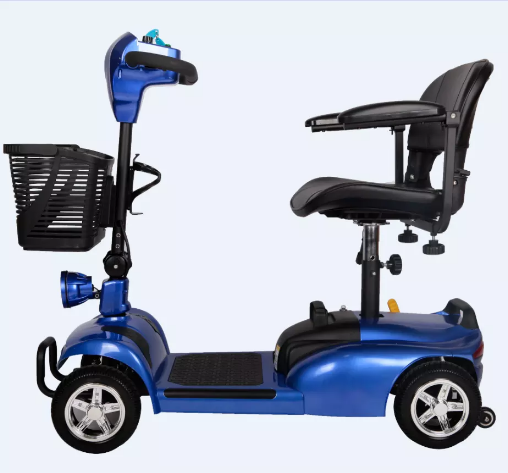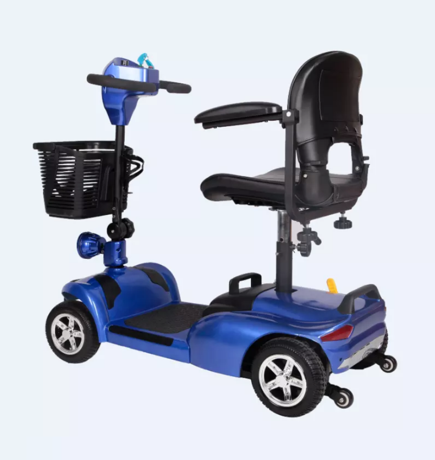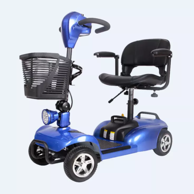 This scooter is not as easily foldable as our Ultra Lightweight 3-Wheeled Scooter or our Elite Electric Wheelchair, it is also significantly heavier coming in at 97 lbs. That means that this scooter is not recommended to fit in the trunk of your car or to be taken on a plane. But it matches the range and speed of the Elite Electric Wheelchair and the versatility of the 3-Wheeled Scooter, at a lower price.