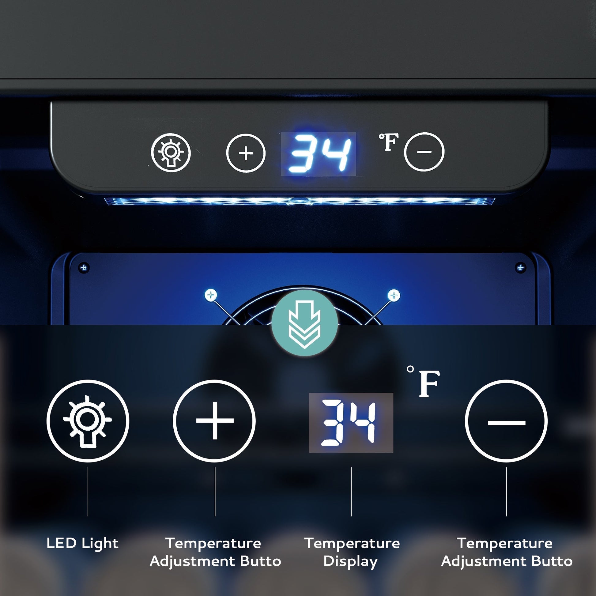 - Front Ventilation & High Speed Air Cooling:The 15 in beverage refrigerator with Handle Product Dimensions 24.4 "D x 14.96 "W x 33.82 "H, and the unique front cooling and ventilation design allows the refrigerator to be placed directly under the countertop without worrying about air circulation. This under counter fridge is equipped with an upgraded cooling system, combined with a fan circulation system and a low vibration compressor, which ensures efficient and quiet cooling so that your wine always tastes good.
