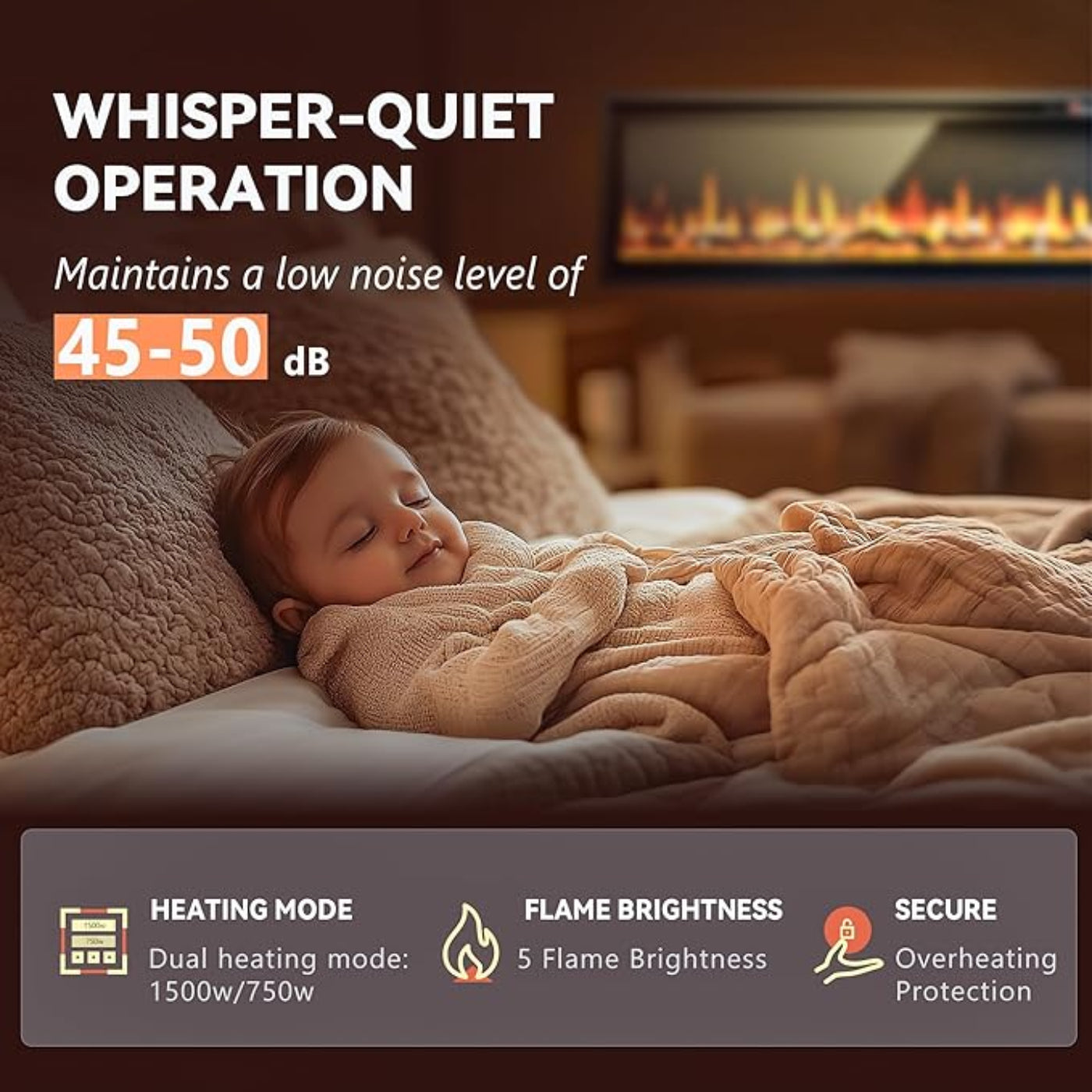 Realistic Flames: LED flame effect with adjustable brightness, creating a cozy, realistic ambiance.