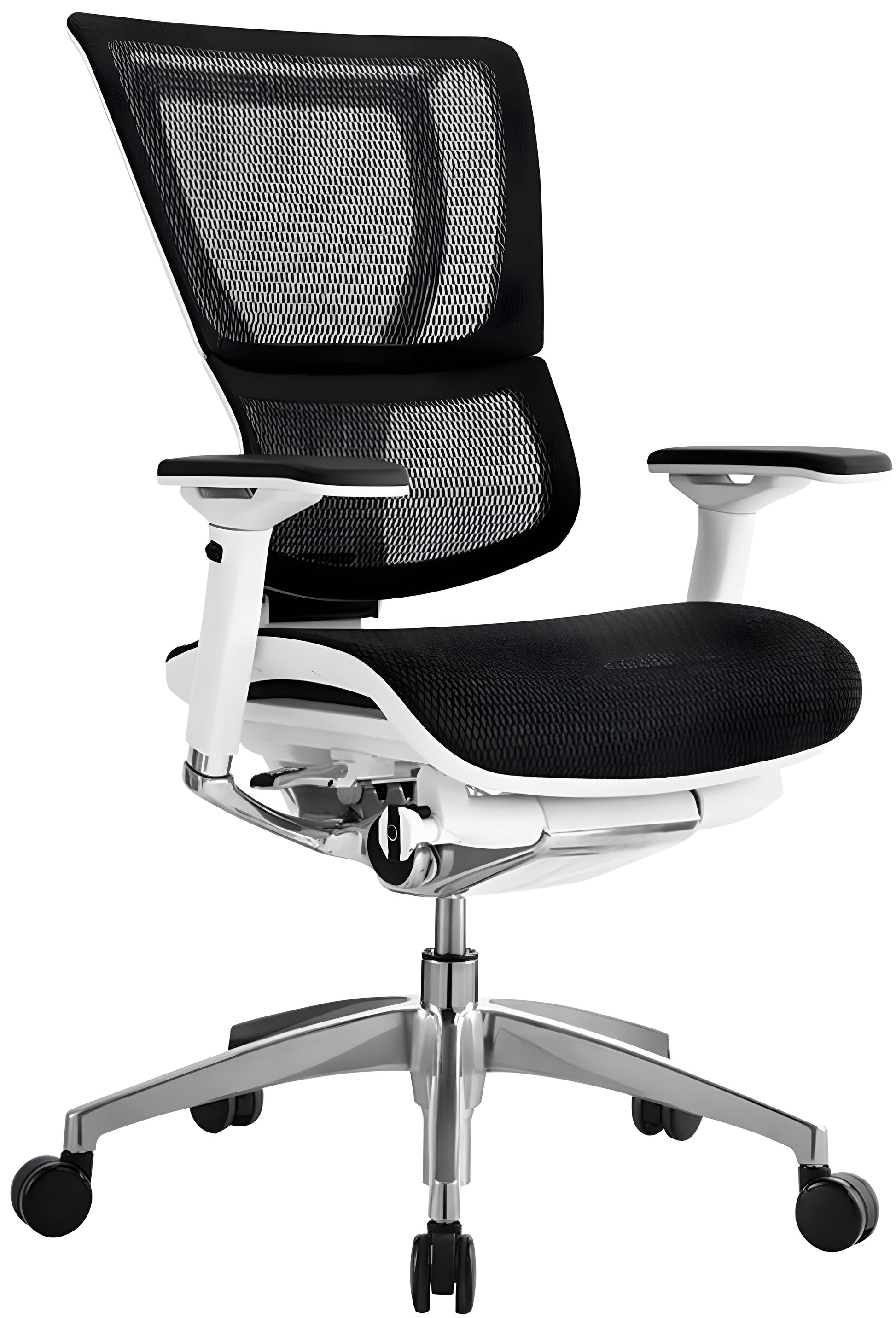The Eurotech iOO Executive Synchronous-Tilt Mesh Back Chair by Eurotech is the product of development, refinement and an obsession with perfection. This executive mesh chair features a standard polished aluminum base, 3D dynamic lumbar support, contoured zero pressure seat, 8-way adjustable arms, single lever control mechanism and a tilt tension control knob. The built-in lumbar support adjusts with you as you move, always ensuring proper support. This attractive executive mesh chair design is available in a black mesh back and black fabric seat with an option of a black or white frame. An optional head rest can also be added onto the back. Watch the video below to learn more about the features of this Eurotech iOO chair!