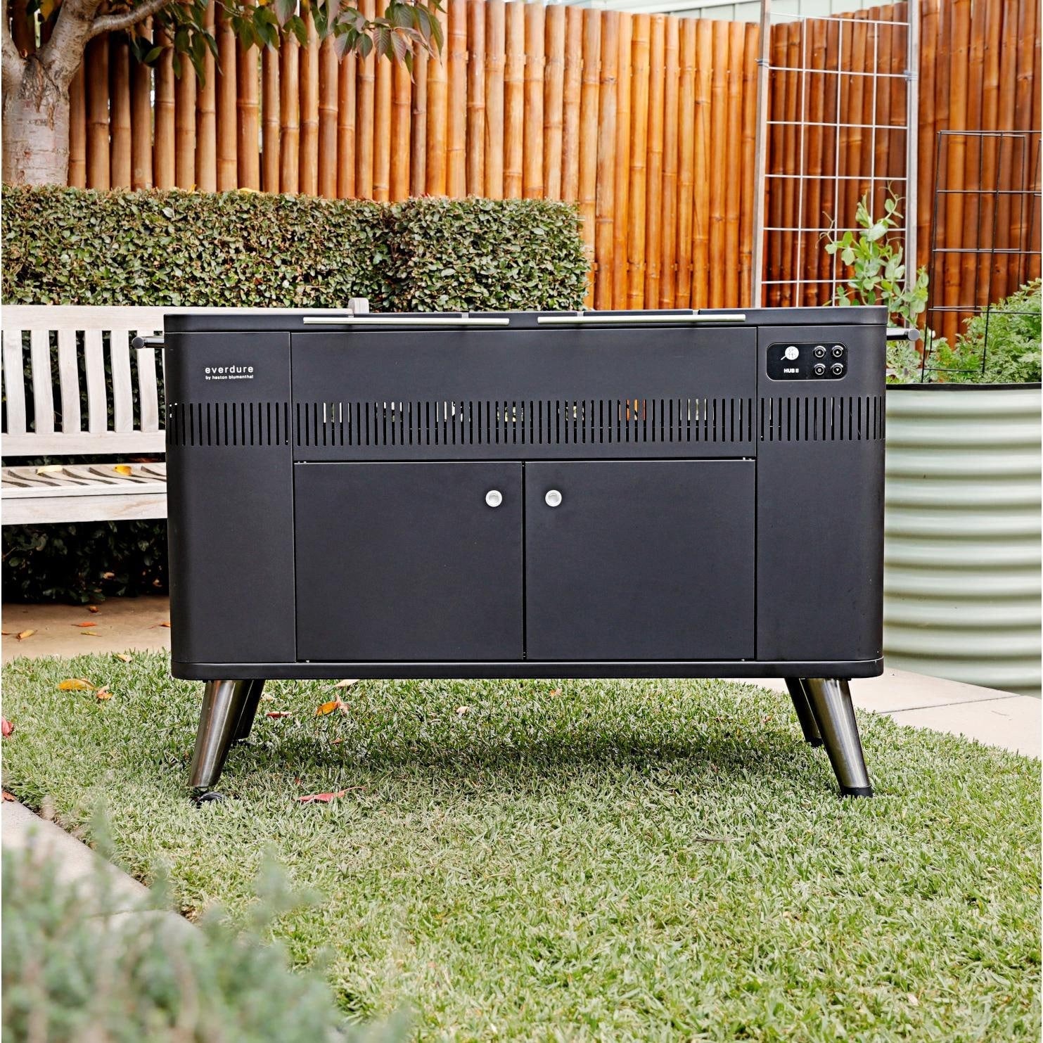 Everdure By Heston Blumenthal HUB l or II 54-Inch Charcoal Grill With Rotisserie & Electronic Ignition - HBCE3BUS. HBCE3BUS. Charcoal Grills. The Everdure By Heston Blumenthal HUB II charcoal grill is great for outdoor grilling and entertainment. The HUB II grill is made of powder-coated steel for long lasting durability. The Fast Flame Ignition System uses a heating element to ignite your charcoal with the press of a button. This will have you ready to start grilling in roughly 10 minutes. The Hub II features a patent pending Rotiscope Technology rotisserie system. With this you get a built-in rotisserie that can be raised or lowered with the touch of a button. The rotisserie includes