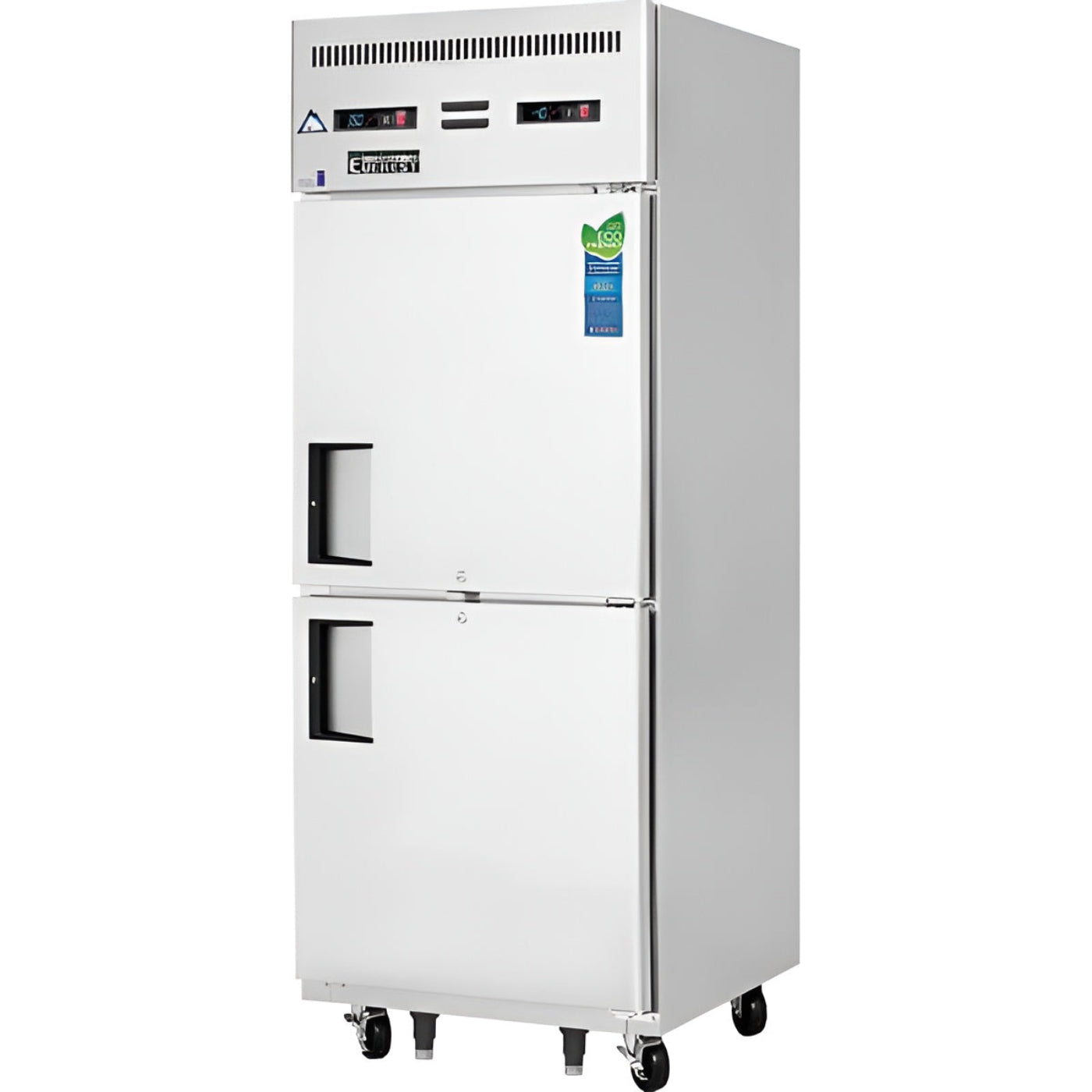 The Everest ESRFH2 is a versatile one-section upright reach-in dual-temperature refrigerator/freezer combo, offering a compact yet efficient solution. It boasts a width of 29-1/4" and is NSF-certified for reliability.This combo unit is divided into two sections, with each section providing 11.0 cubic feet of storage capacity. The top section serves as a refrigerator, while the bottom section functions as a freezer. Both sections feature self-contained top-mounted refrigeration for optimal cooling.The ESRFH2 is equipped with two solid hinged, self-closing, and field-reversible half-doors that lock securely. The interior layout includes two epoxy-coated wire shelves with height-adjustable clips for flexible storage.Digital controls with an LED display ensure precise temperature management, while the auto-defrost feature enhances efficiency. The interior is well-lit with LED lighting, making it easy to locate items.Constructed with durability in mind, this unit features a stainless steel interior and exterior, with stainless steel sides and a galvanized steel top, bottom, and rear. Two leg stabilizers offer added support.The ESRFH2 operates on a 1/2 HP compressor, requiring 115V/60/1-ph power with 7.57 amps. It comes with a cord and NEMA 5-15P plug for easy setup. With its NSF, cETLus, and ETL-Sanitation certifications, this combo unit is a reliable choice for businesses seeking both refrigeration and freezing capabilities in a compact package.