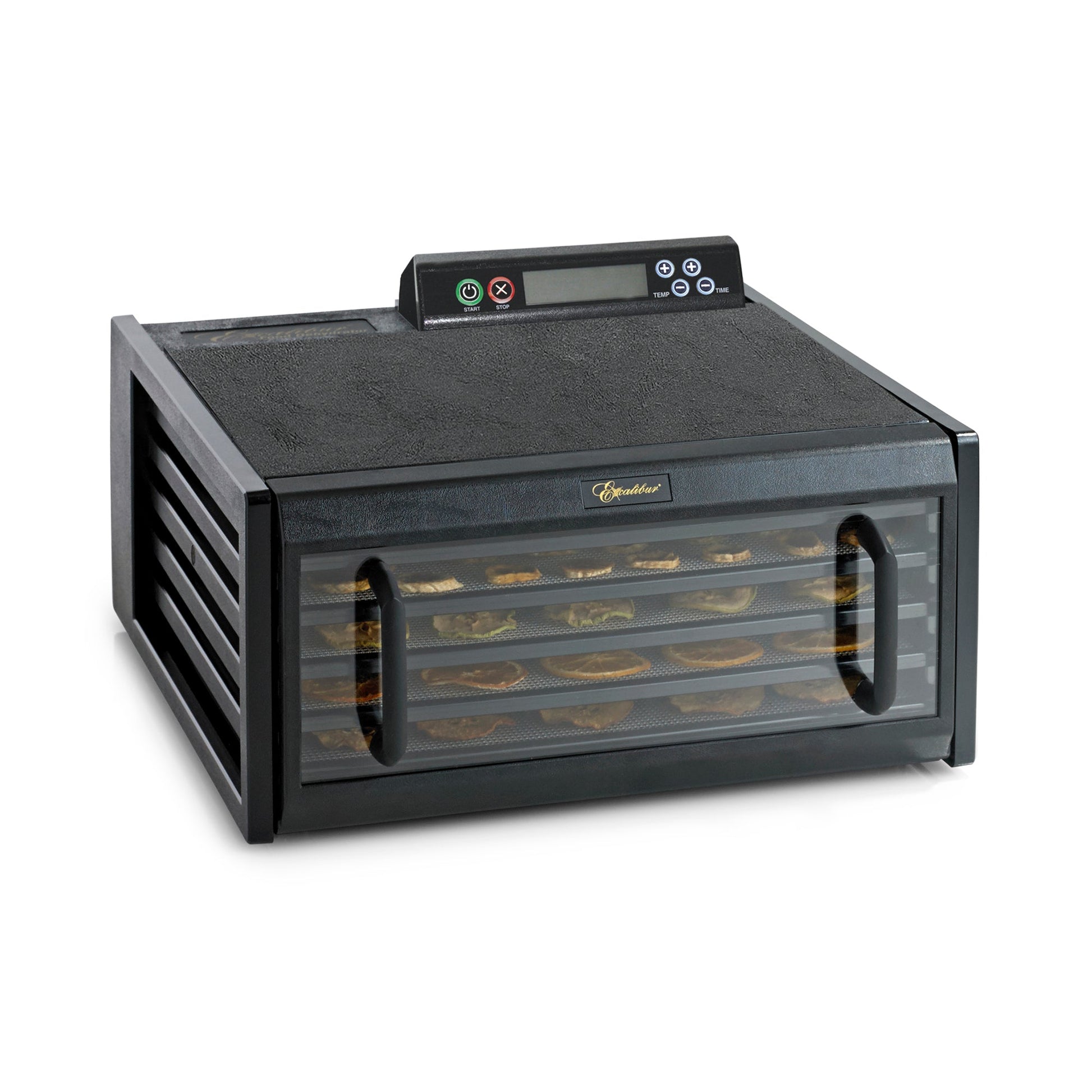 Dehydrate like a pro with the Excalibur 5-Tray Food Dehydrator. By making your own dehydrated foods, you can provide your family with all natural, healthy foods with no added sugars or preservatives. The 48-hour digital controller allows for two times and two temperatures to be set. The unit dehydrates at a range of 95 degrees Fahrenheit to 165 degrees Fahrenheit, the optimal drying temperature for herbs, fruit, meat and much more. The dehydrator comes with a clear polycarbonate door for easy view of drying and five plastic trays with enough room to dry a variety of foods. After loading food onto the trays, set the dehydrator at a higher temperature for a specified period of time, then set the dehydrator at a lower temperature for a specified period of time. The unit automatically adjusts after the first setting and turns off when the second setting is complete. Dehydrate fruits, vegetables, nuts, meat for jerky, fruit puree for fruit roll-ups, raise bread or make homemade yogurt. Excalibur's patented Hyperwave technology and horizontal Parallex drying removes water from food with a continuous circulation of thermostatically-controlled warm air. This black dehydrator has an 8 square foot capacity and five-inch fan. Includes a free “Guide to Dehydration” and a free download for “Preserve It Naturally” so you can learn how to dehydrate all types of foods. Covered by the Excalibur 10-Year Limited Warranty.