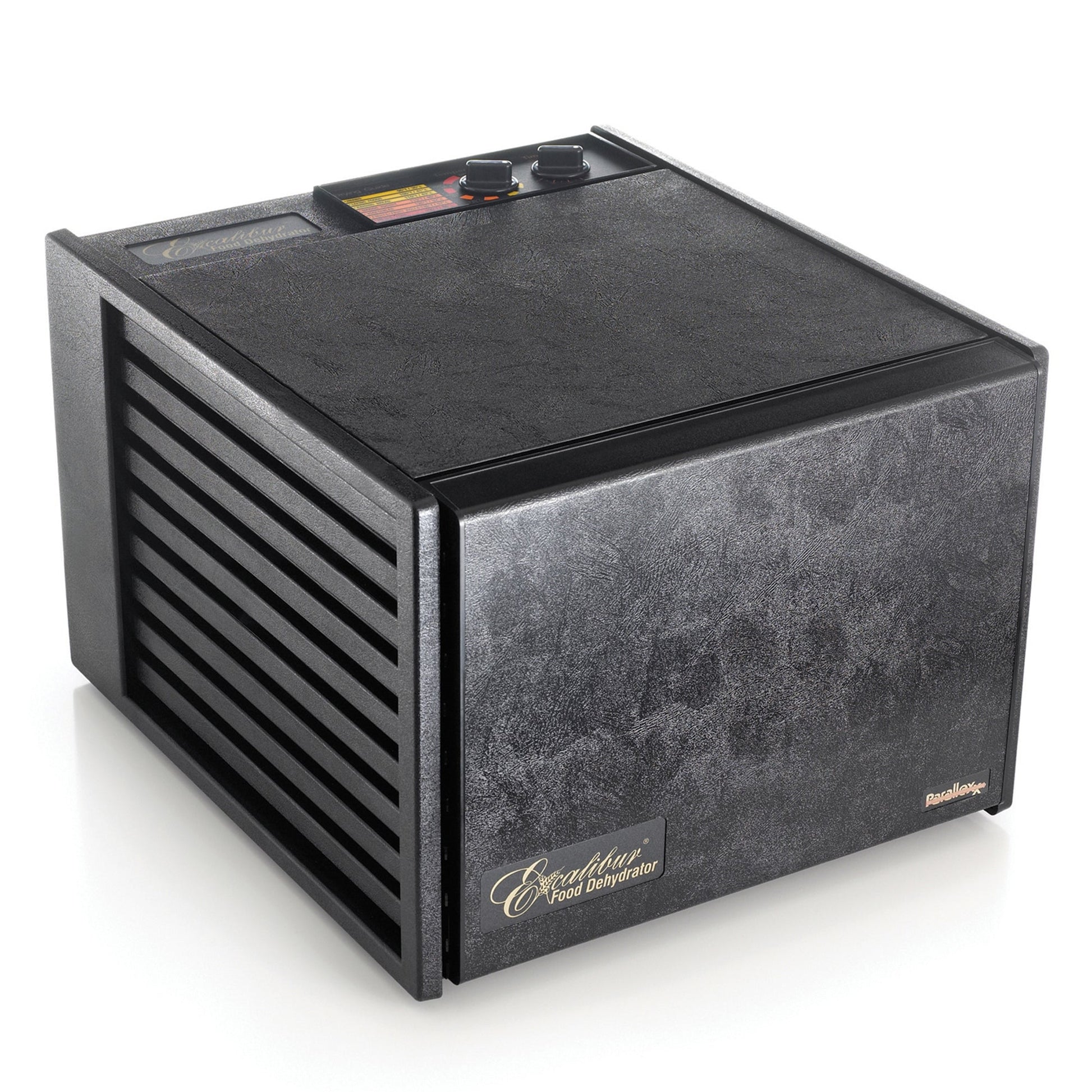 The Excalibur 3926TB Electric Food Dehydrator has a 26-hour time so it is ideal for dehydrating a wide range of foods such as fruits, vegetables, jerky, homemade yogurt and so much more. It is the perfect way to make wholesome snacks for you family. Excalibur's patented Parallexx Horizontal Airflow distributes air evenly over each tray allowing food to dry faster, retain more nutrients and taste better. Hyperwave Technology ensures food temperature stays low enough to maintain enzymes and nutrients in foods being dehydrated by controlling evaporative moisture. With 9 trays that measure 15 x 15 inches each, and 15 square feet of dehydrating space, you will have plenty of room to dry a large quantity of food. The adjustable thermostat lets you set the temperature from 105 degrees Fahrenheit to 165 degrees Fahrenheit. Limited 10-year Warranty. Overall Dimensions: Width: 17, Depth: 19, Height: 12 1/2. Includes a downloadable Guide to Dehydration.