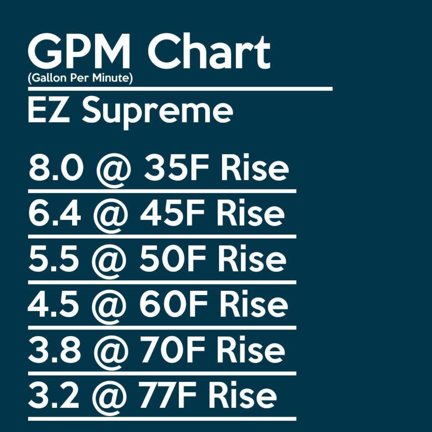The EZ Supreme is a whole home water heater designed for households of 1-3 bathrooms, averaging between 5-7 GPM. The EZ Supreme is also a self regulating water heater, meaning the heater automatically adjusts the burners according to the water flow to ensure the desired temperature is reached at your tap. Simply set the temperature on the screen and the heater does the rest of the work for you! For instance, the average sink tap runs about 1 gallon per minute while the average shower head runs about 1.7- 2 gallons per minute. With this in mind, the EZ Supreme can easily handle any two hot water taps running simultaneously and in some cases three!