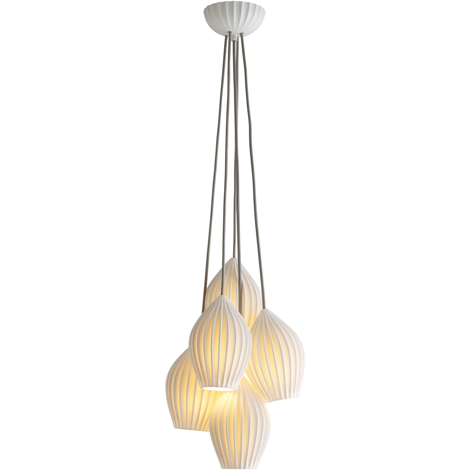 Original BTC's favourite Fin pendant is now available in a series of eye-catching groupings, perfectly suited for creating a stunning focal point in sitting rooms, hallways, and dining rooms. The intricate and decorative hand made bone china shades will bring a warm and enhancing glow to any setting, and can be hung at different lengths, depending on personal preference. The exquisite matching ceiling rose, completes the look beautifully.