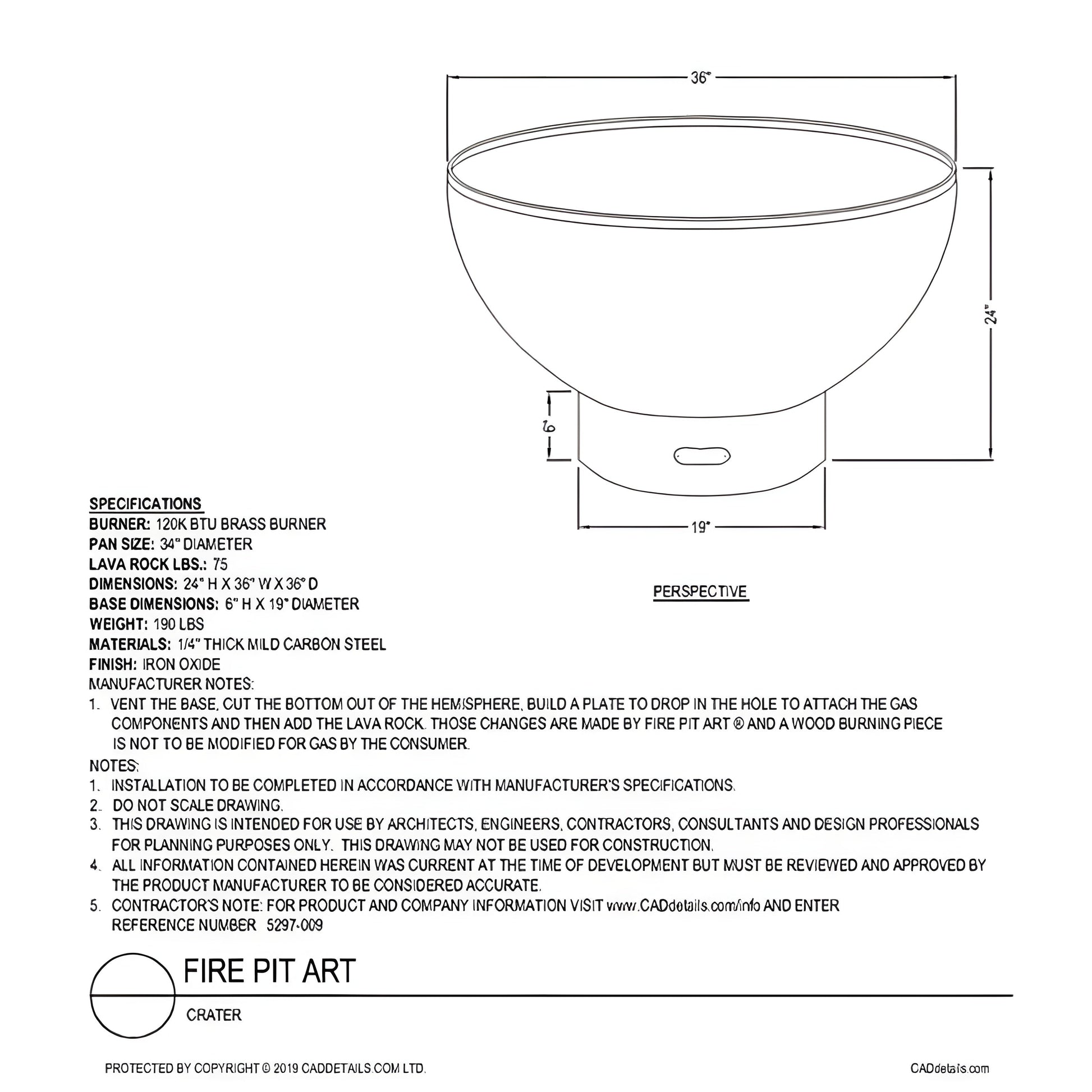The Fire Pit Art Crater is a classic, yet modern fire pit design that will add a warm ambiance to your backyard. The bowl-shaped carbon steel frame weighs 190 pounds and has an impressive 120 thousand BTUs output! It's made from 1/4" thick mild carbon steel that makes it durable enough for any weather conditions you might face in the fall or wintertime. This particular bowl fire pit is 24" H x 36" W x 36" in Depth. The fire pit's patina will darken over time and remain permanent, thanks to its durable outer layer.