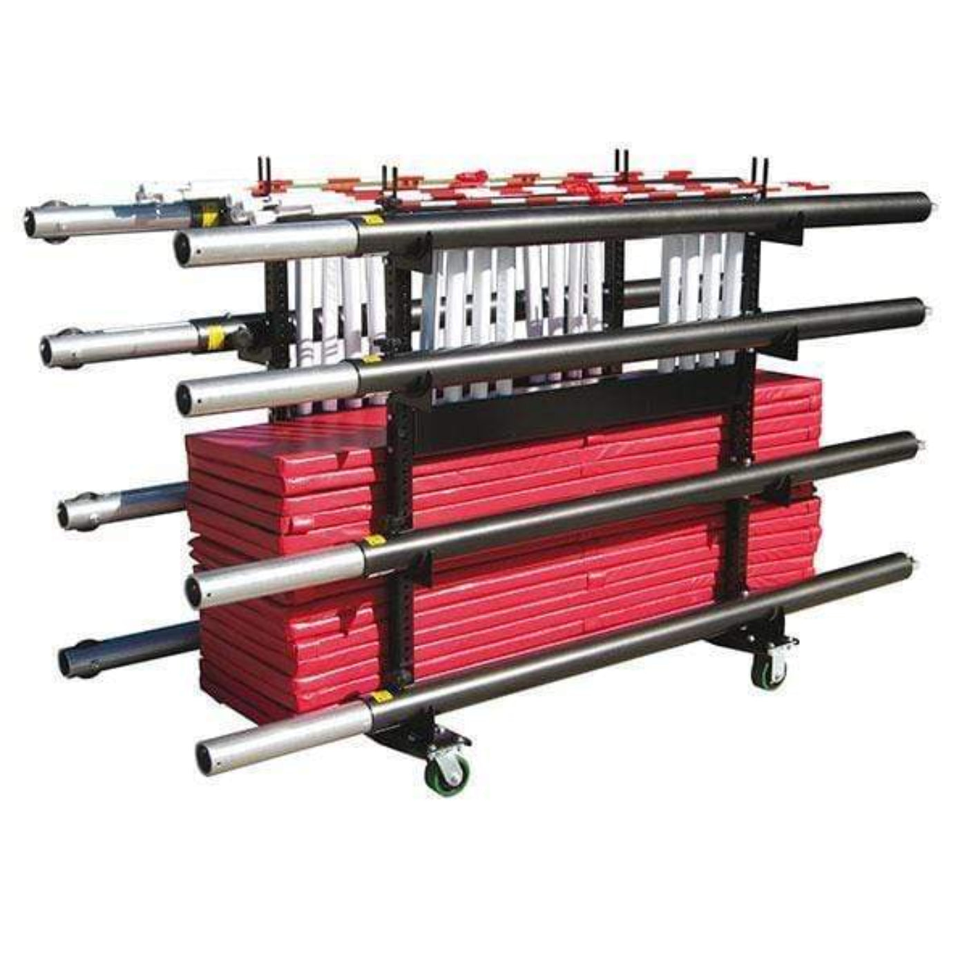 Equipped with non-marking casters and cushioned post cradles to protect equipment and gym floors.