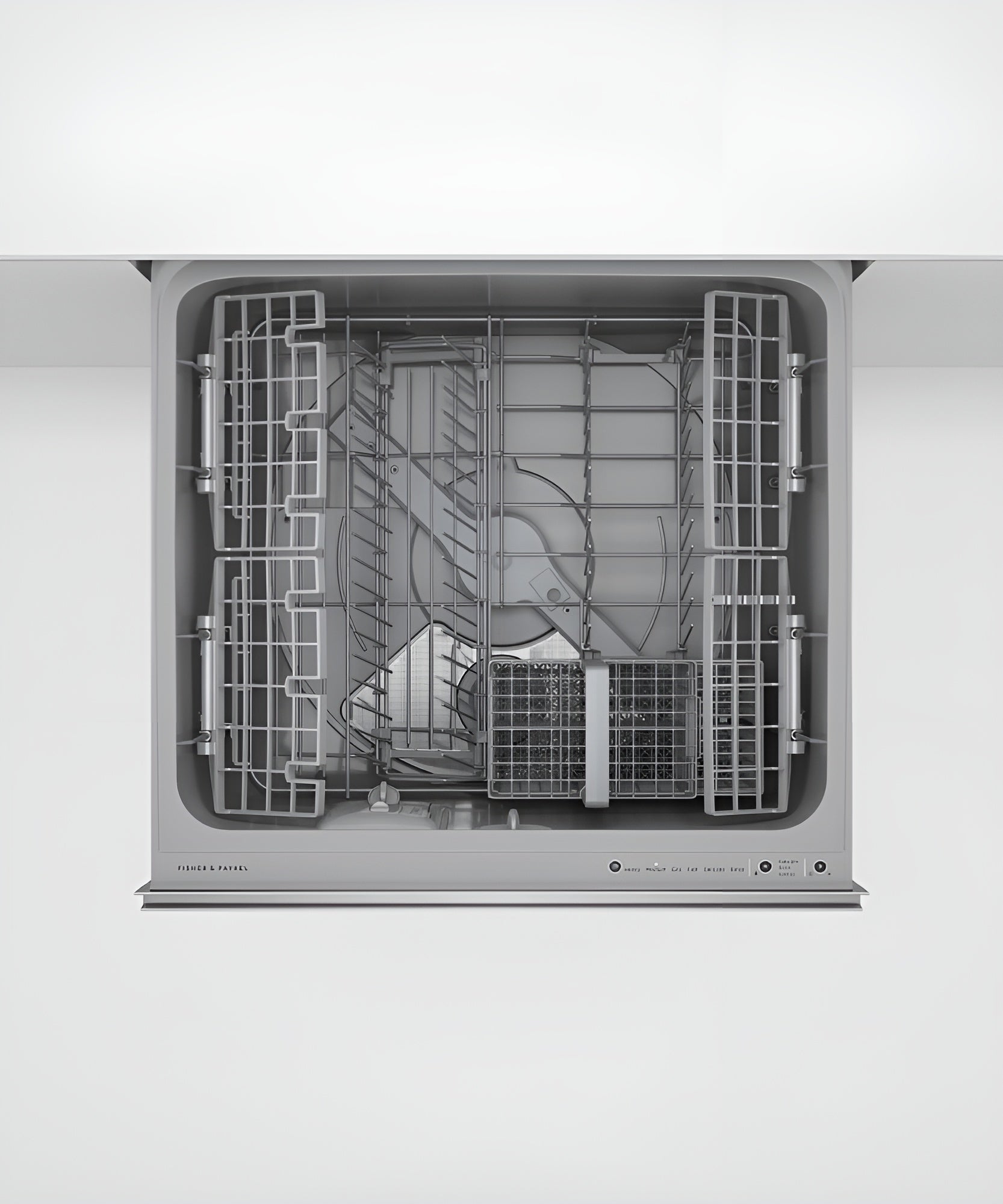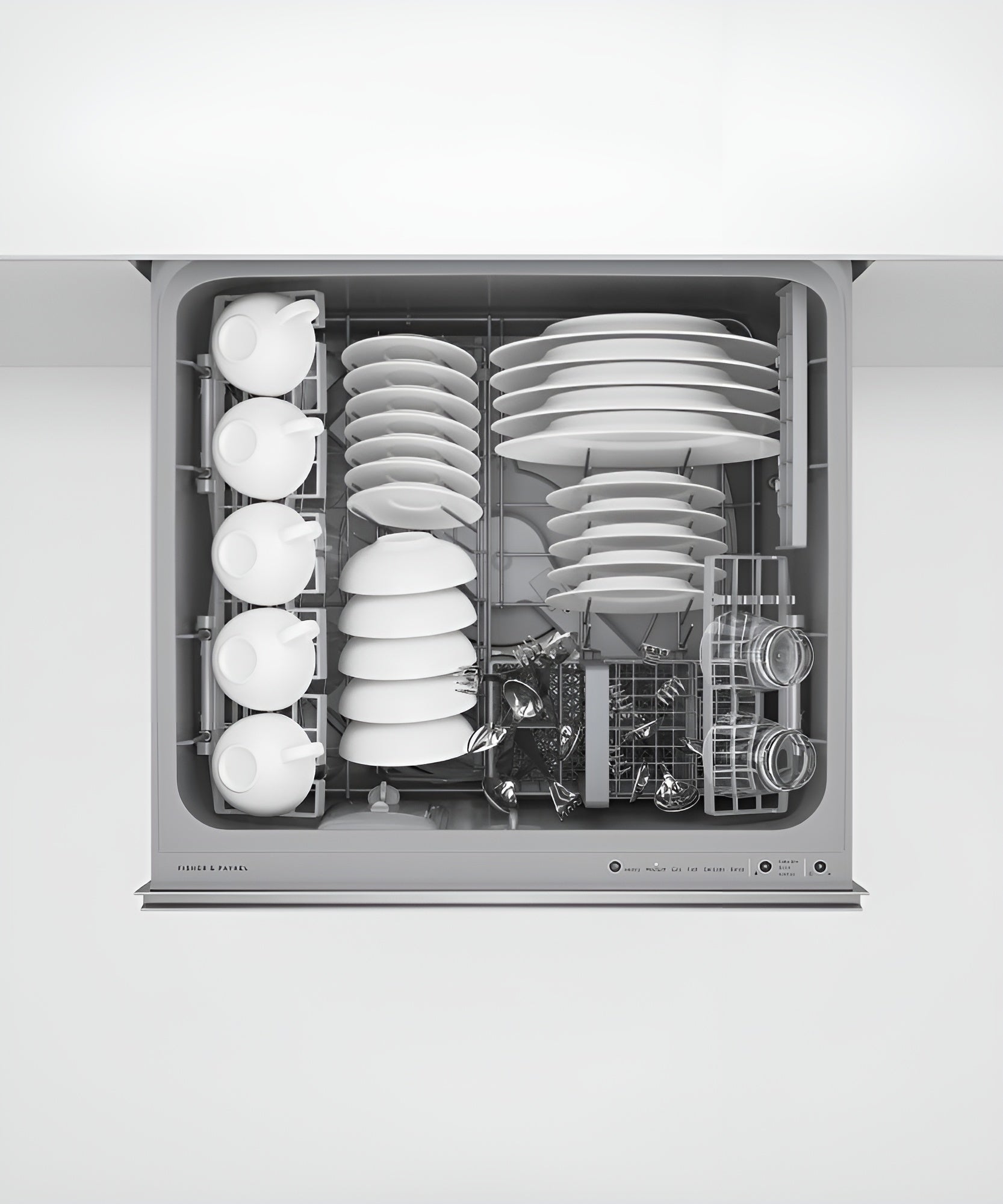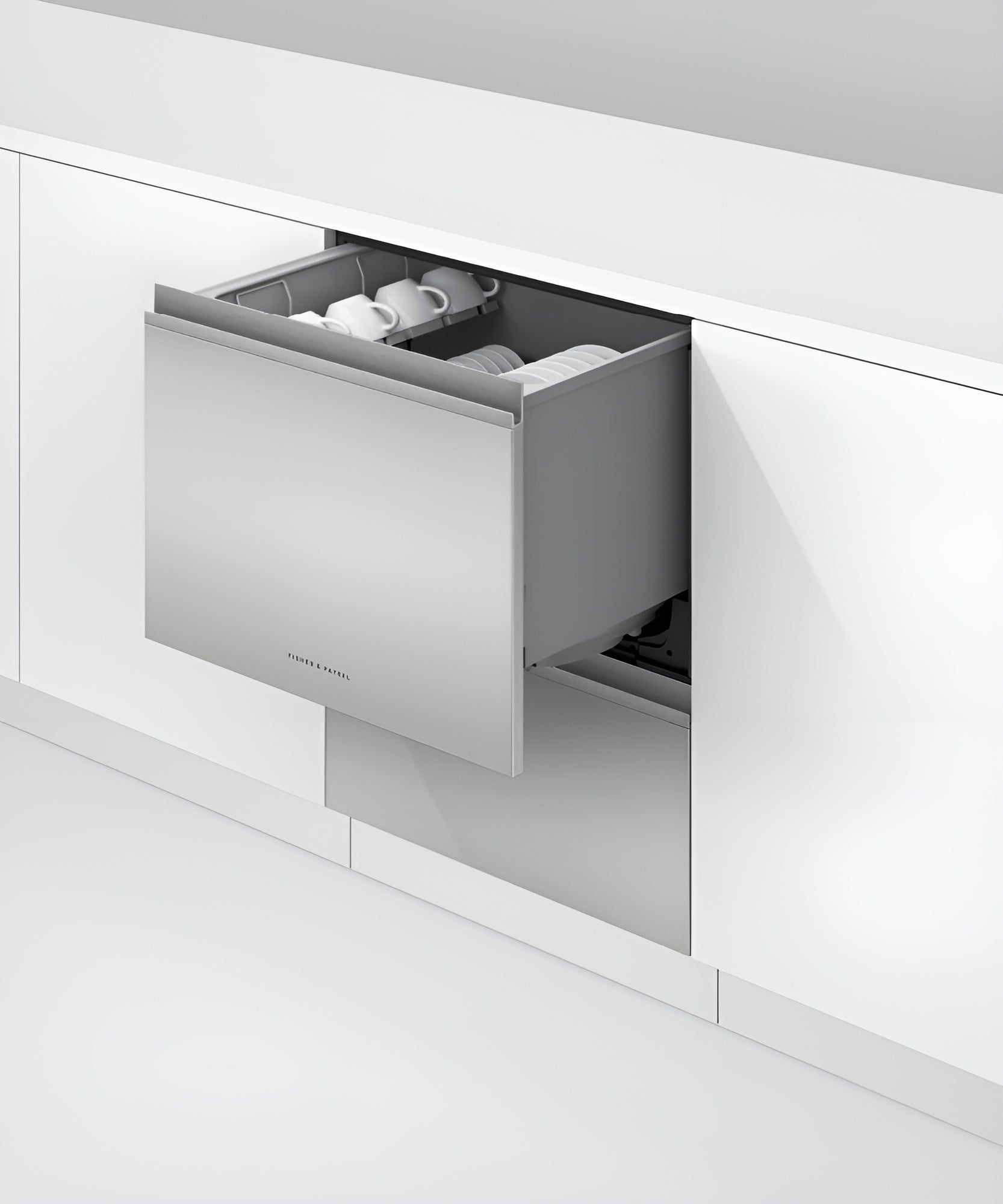 Wash one drawer while you load the other, with room in each drawer for full-size dinner plates.(BR)Finish Stainless Steel