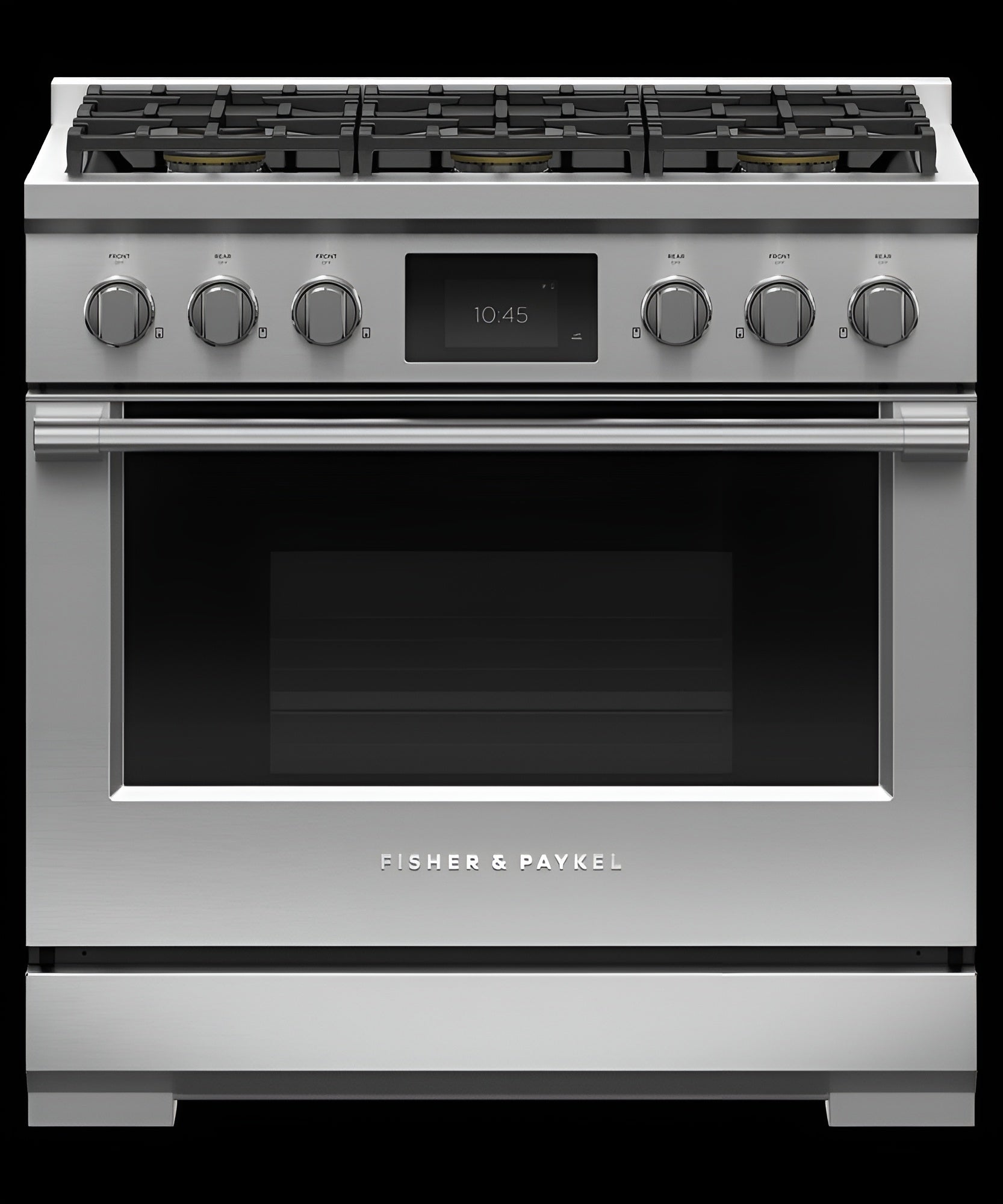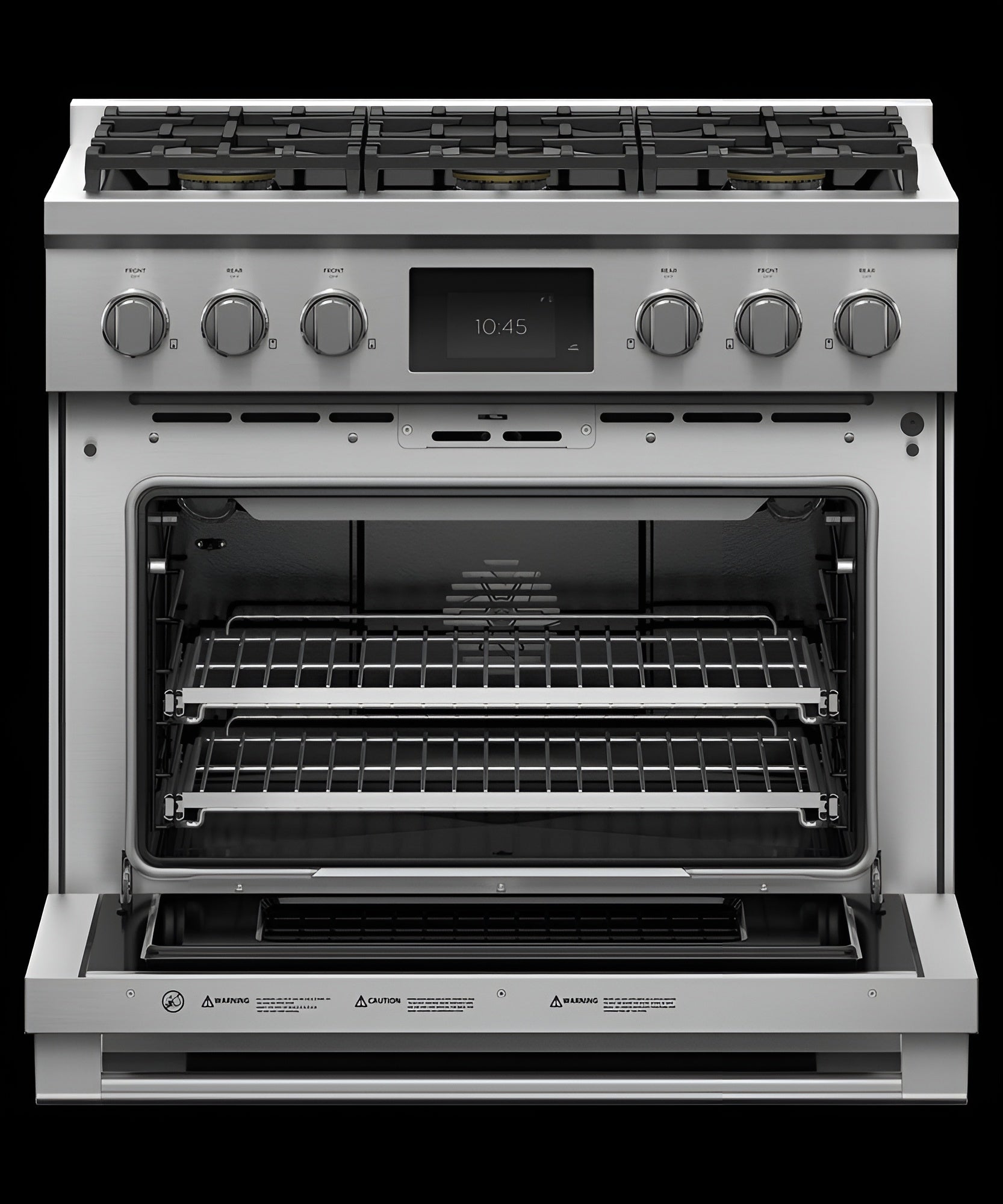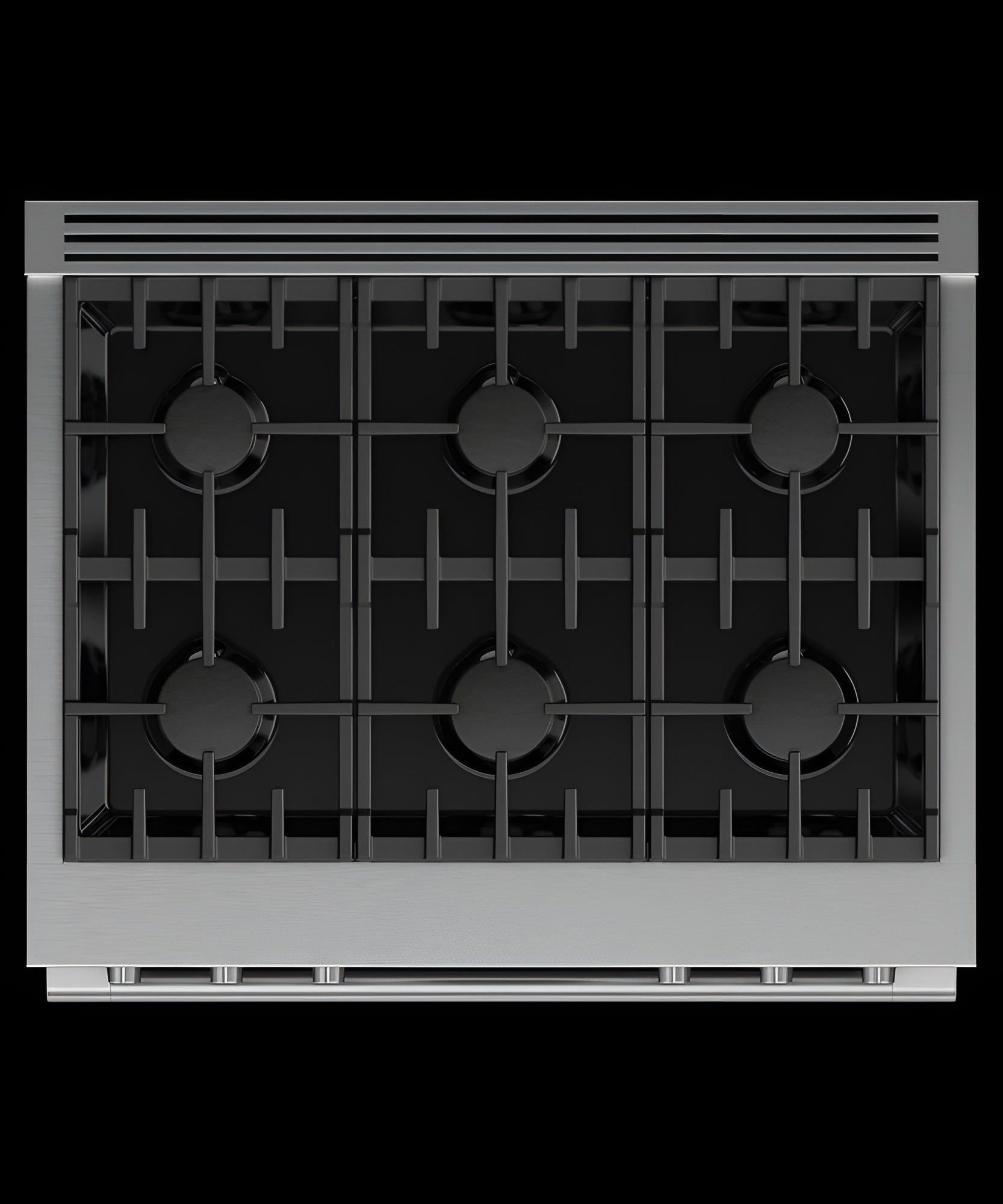 A: It includes 6 high-powered sealed burners for precise cooking control, with dual-flame burners for rapid boiling and simmering.