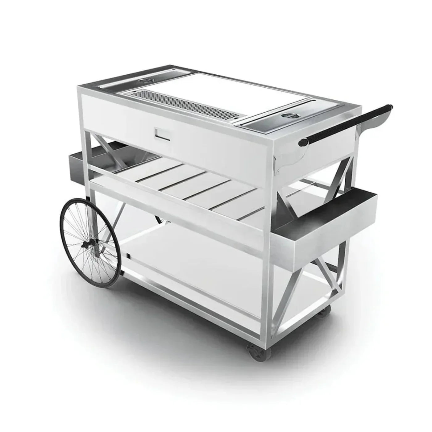 A: The cart features a butcher block work surface, high-pressure laminate (HPL) finish, and a brushed stainless steel tube X-frame.