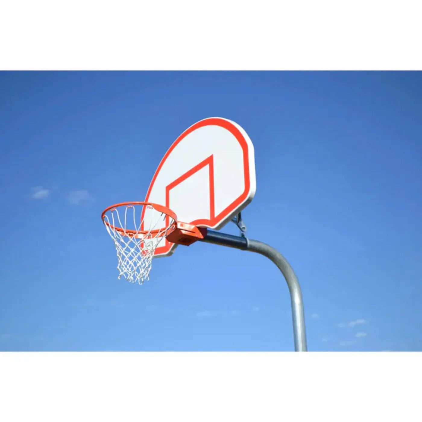 The 1266B rear-mount fan-shape steel backboard provides the strongest backboard available for rugged playground use. The 12 gauge steel shell sports a white powder coat finish with orange border and shooter's square.