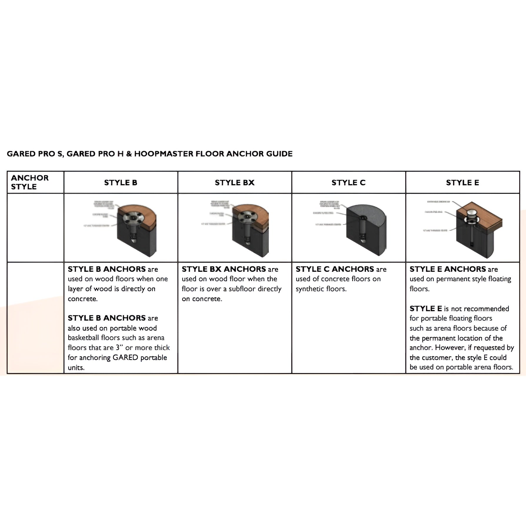 FLOOR ANCHORING SYSTEM: Floor anchors and locater pins are included as standard. Specify floor type.