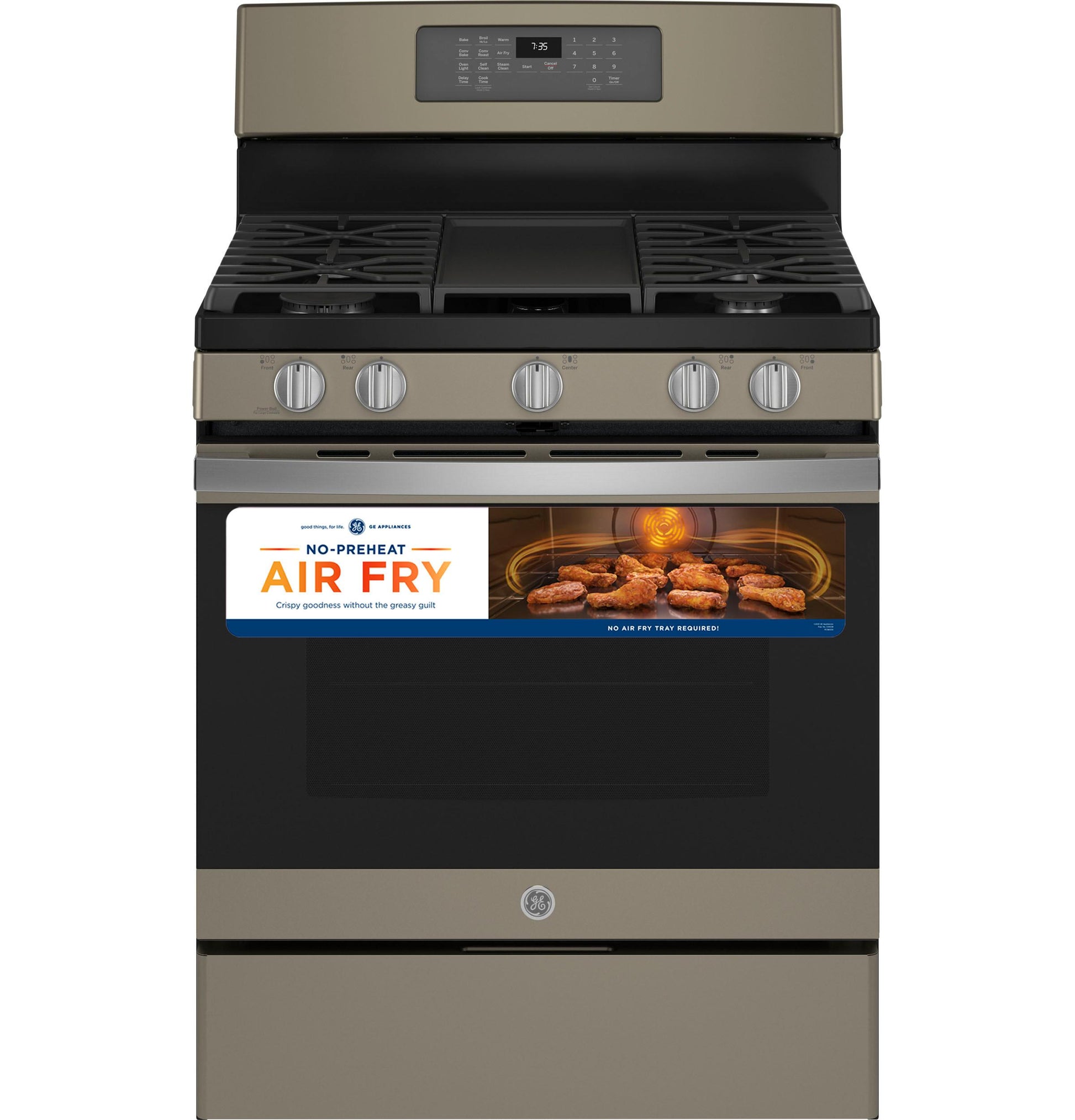 A: This GE® 30" gas convection range features No Preheat Air Fry, a powerful 18,000 BTU burner, edge-to-edge cooktop, and self-cleaning oven for effortless maintenance.