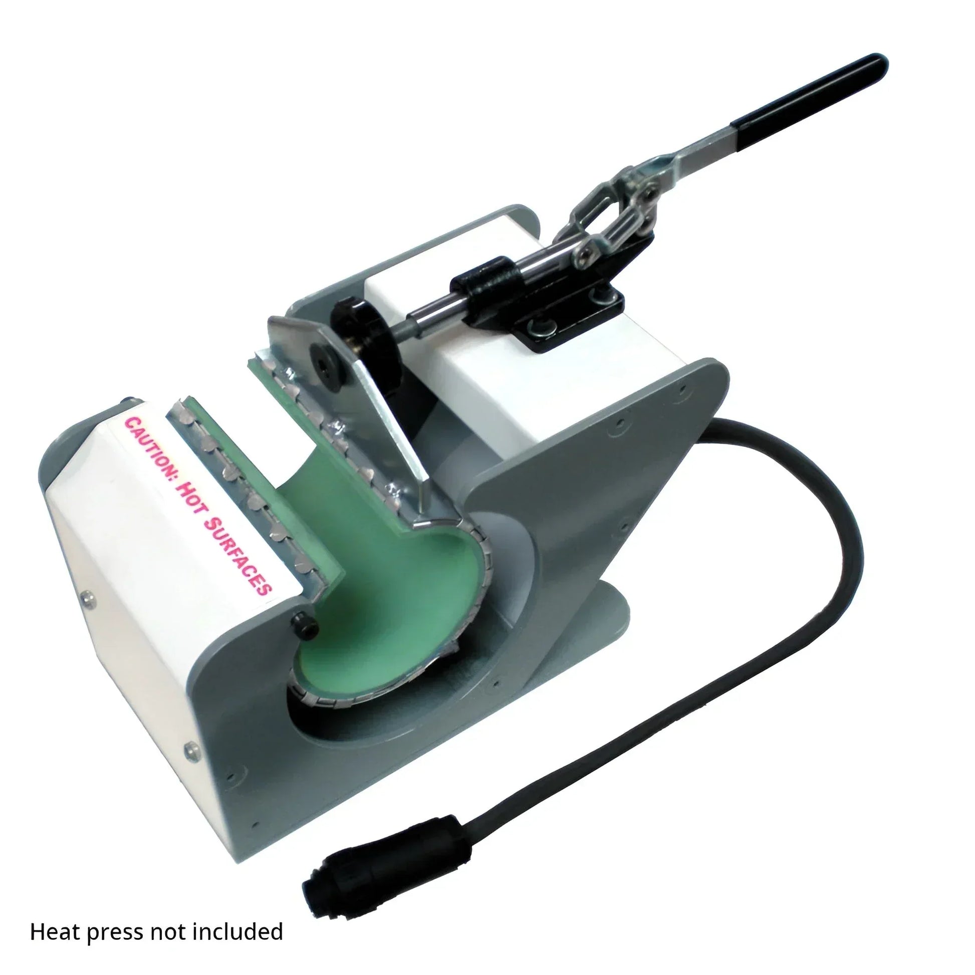 The Geo Knight Digital Combo Full-Wrap Mug Attachment is specifically designed for use with Geo Knight Digital Combo Heat Presses (heat press sold separately). This attachment allows for full-wrap sublimation printing on standard cylindrical sublimatable items, similar to the capabilities of the DK3 model Geo Knight heat press.