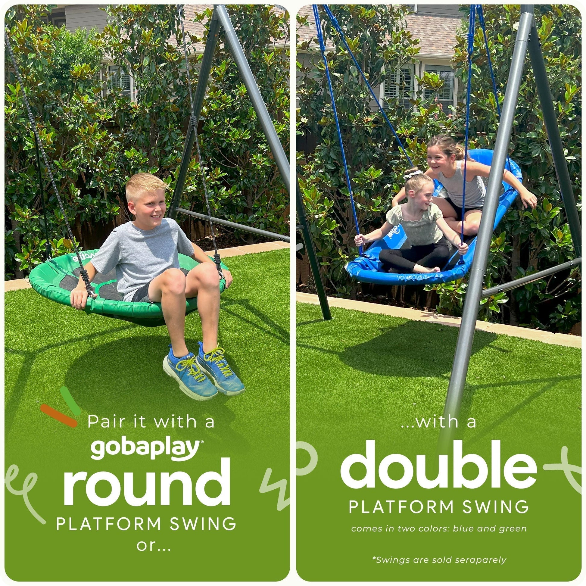 Elevate your swinging experience to new heights while bringing a contemporary and stylish touch to your backyard with this gobaplay Single Swing Frame bundled with the gobaplay Round Tree Swing Platform and gobaplay Hanging Tent.