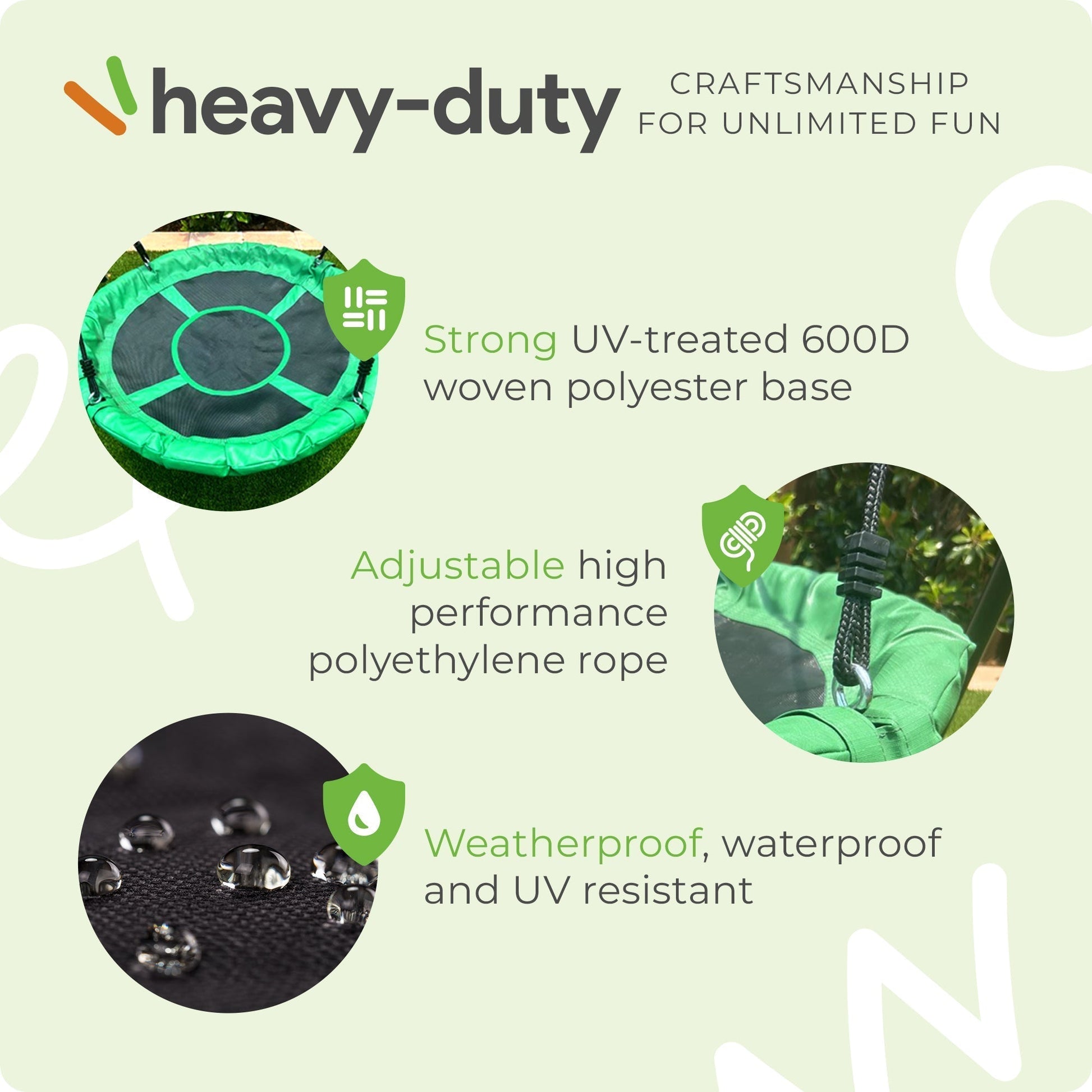- Durable 600D polyester and waterproof design ensure the swing withstands outdoor elements