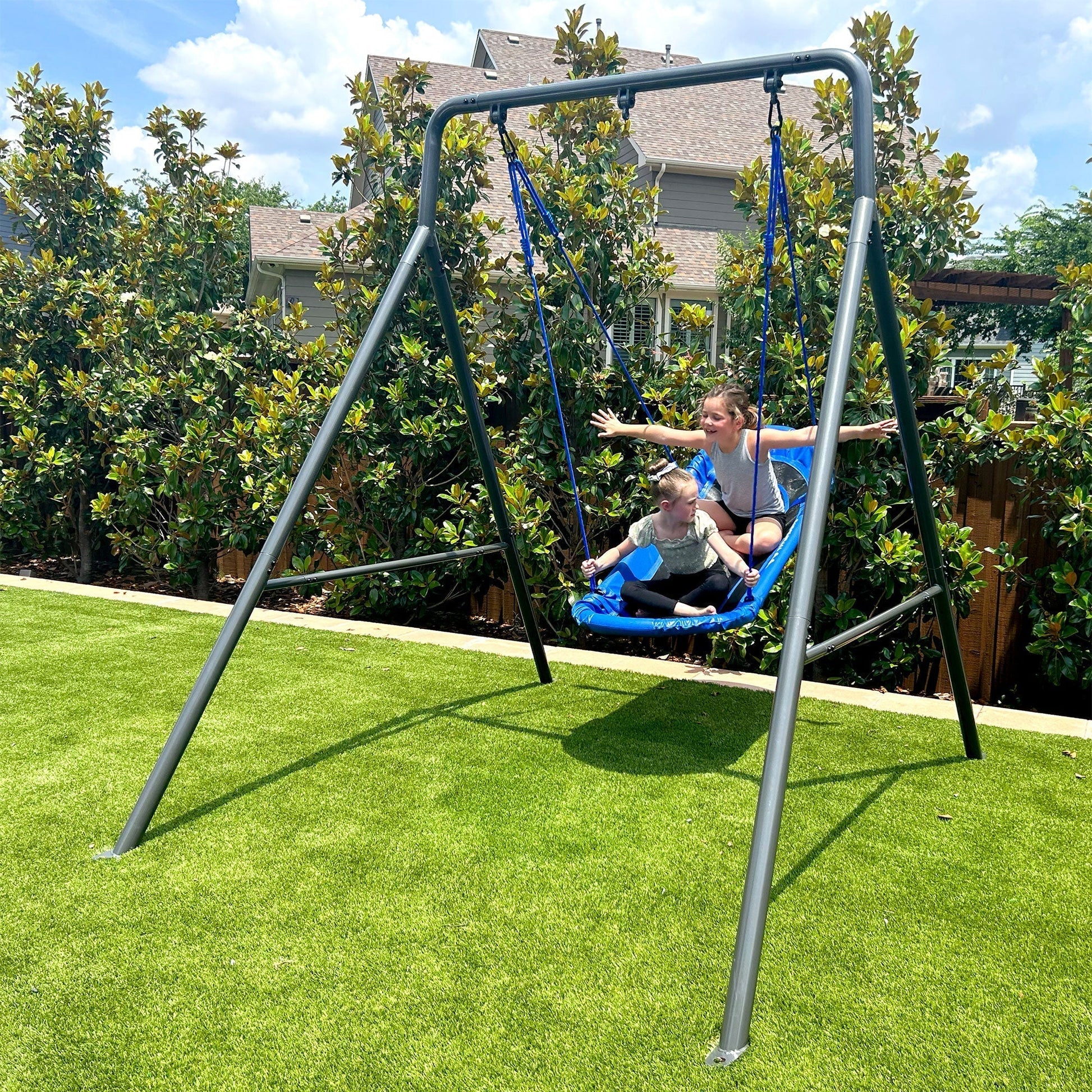 A: The frame stands tall and wide enough to support various swing attachments, while the boat swing provides ample space for two or more riders.