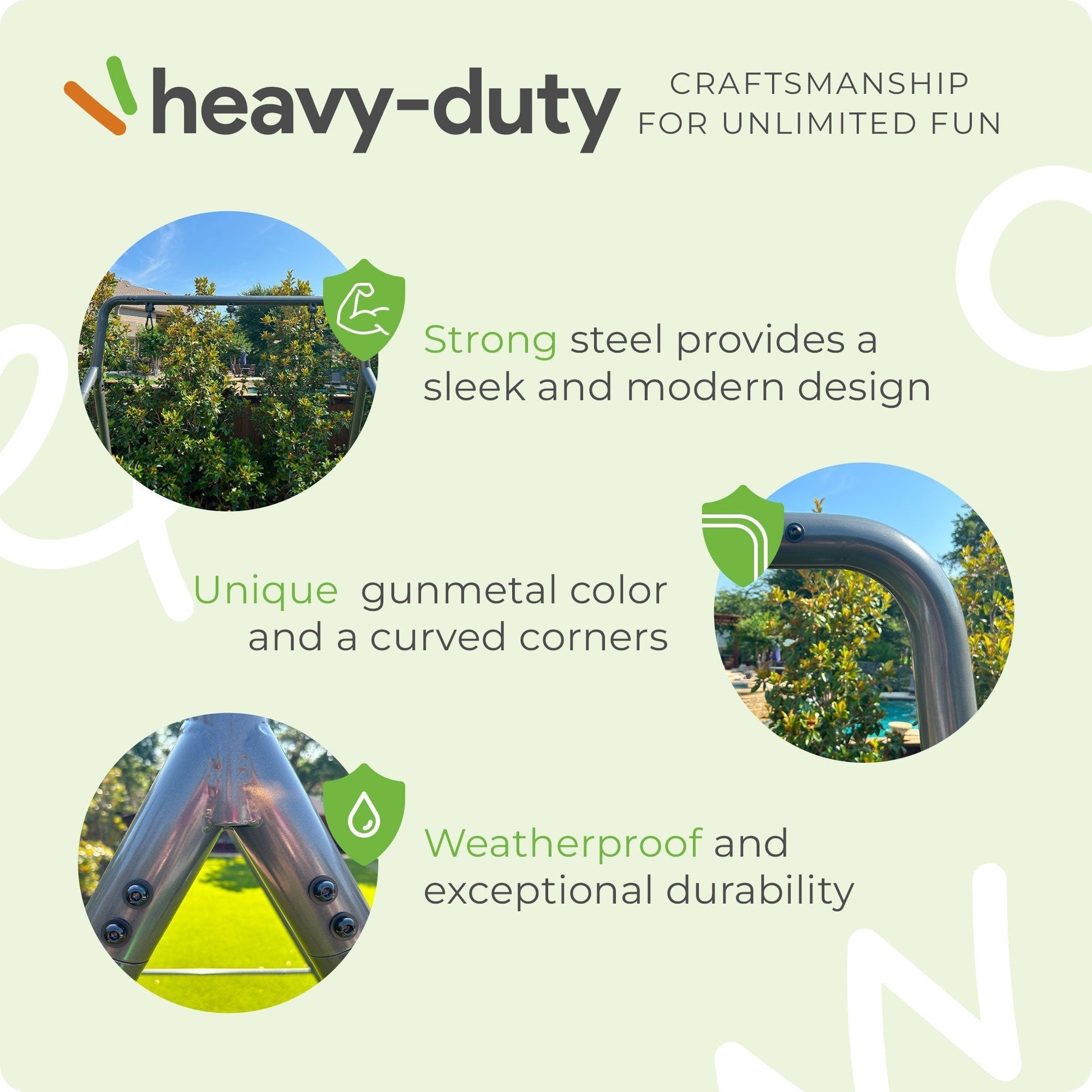 With the diverse swings, including the sophisticated Single Swing Frame and the versatile Double Platform Tree Swing, you can transform your outdoor space into a hub of excitement and adventure. The Single Swing Frame exudes modern elegance with its sleek design, curved corners, and eye-catching gunmetal finish. Crafted for durability and stability, this swing set ensures countless hours of safe and enjoyable swinging for children and adults alike. Its weather-resistant construction and user-friendly assembly process make it the ideal addition to any backyard setting, promising years of cherished memories and outdoor fun. The Double Platform Tree Swing delivers an unparalleled swinging experience and versatile options for those seeking exhilarating thrills.