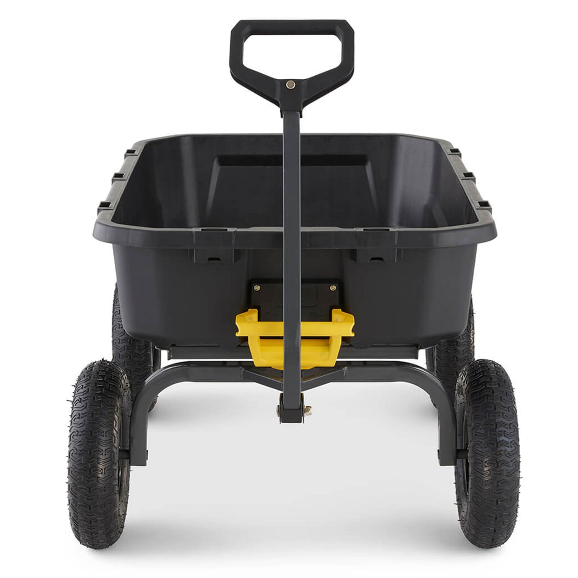 What sets this cart apart is its balanced, extra-wide base and 4-wheeled stability, handling heavy loads up to 1,600 pounds. The patented, integrated 2-in-1 handle offers the flexibility to tow the cart behind a lawn tractor or ATV or pull it by hand. This versatility makes it an indispensable tool for garden, lawn, barn, or farm tasks. The sturdy frame and high-capacity tub mean you can carry large amounts of materials in one trip, saving time and effort.
