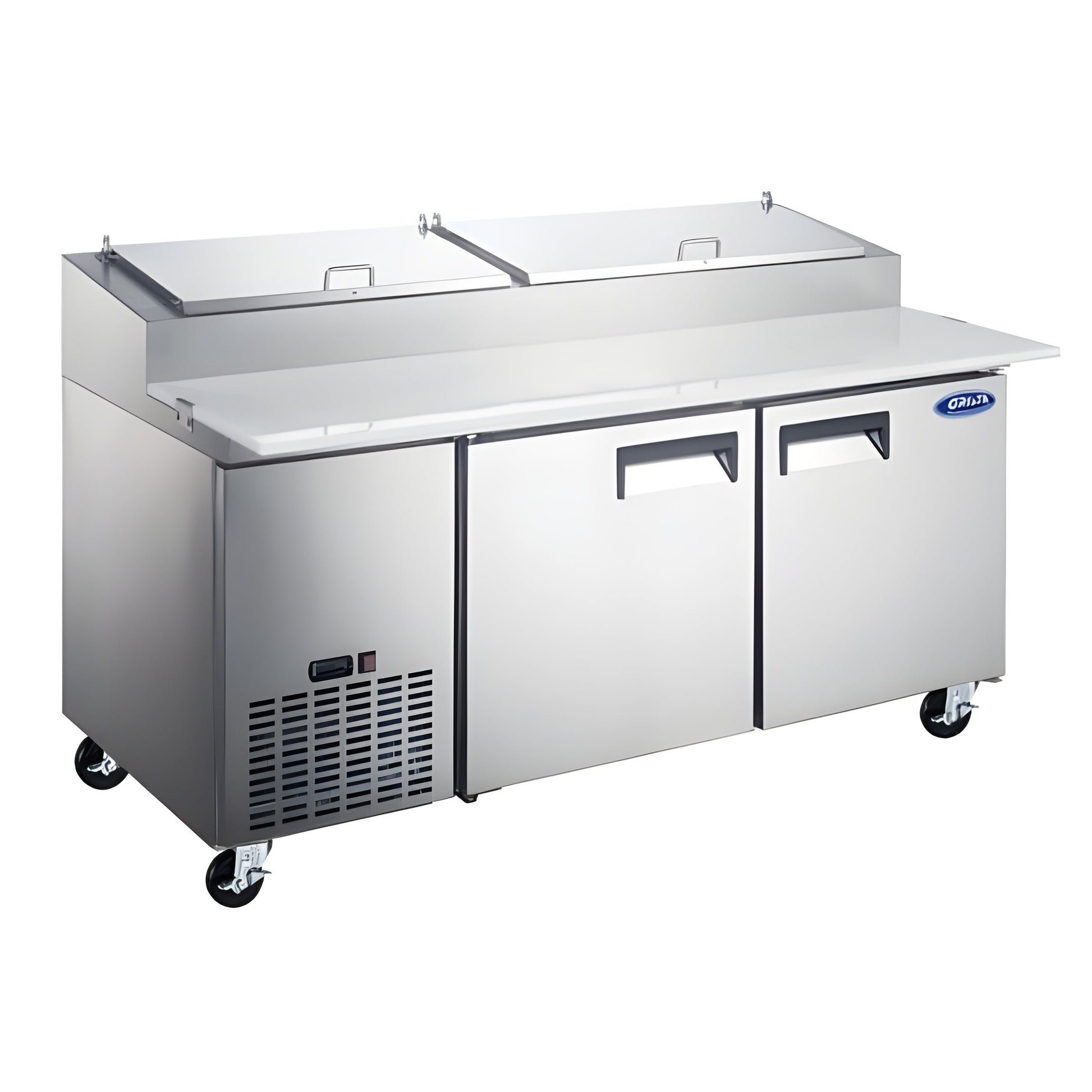 Grista’s Pizza Prep Tables are constructed of heavy duty stainless steel making them strong and durable enough to survive in any kitchen environment. Store all of your toppings in the refrigerated pan rail that can hold a variety of different sized food pans up to 6” deep. The hinged insulated cover keeps the toppings cold when not in use. Store additional items below in the cabinet for quick access when needed. All pizza prep tables come with 4” casters, plastic coated wire shelving and a 19” extra deep, 3/4” thick polyethylene cutting board. These models are ETL Listed and ETL Sanitation. They are backed with a 1 year warranty on parts and labor and a 5 year warranty on the compressor.