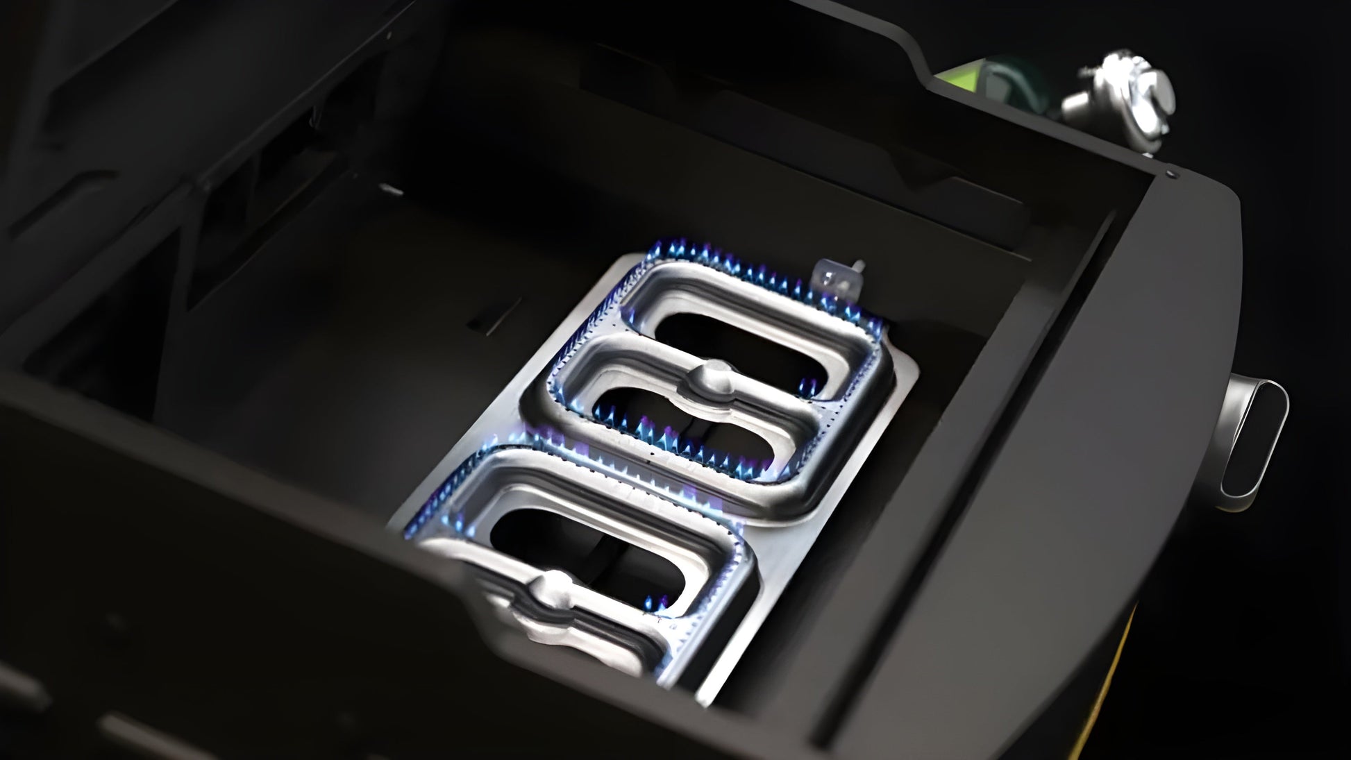 A: It includes a powerful single burner, dual heat zones for precise temperature control, a pre-seasoned griddle surface, push-button ignition, a rear grease management system, and a durable, weather-resistant build.