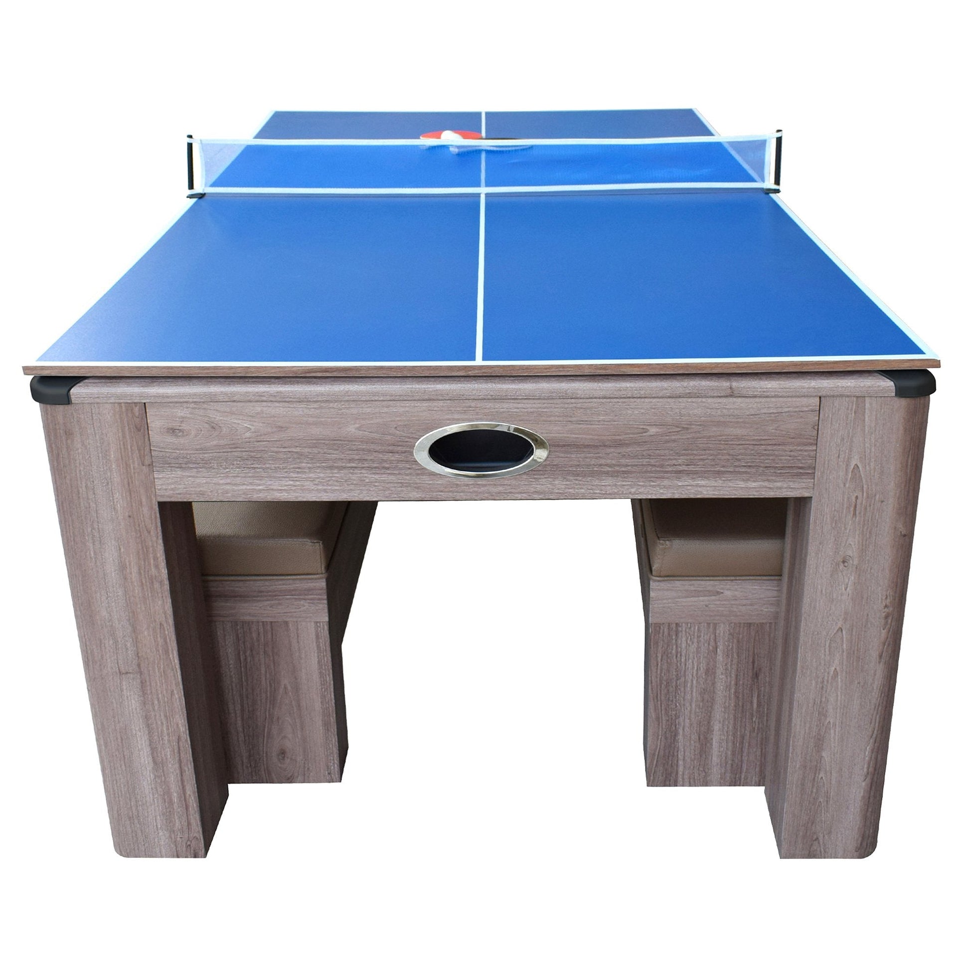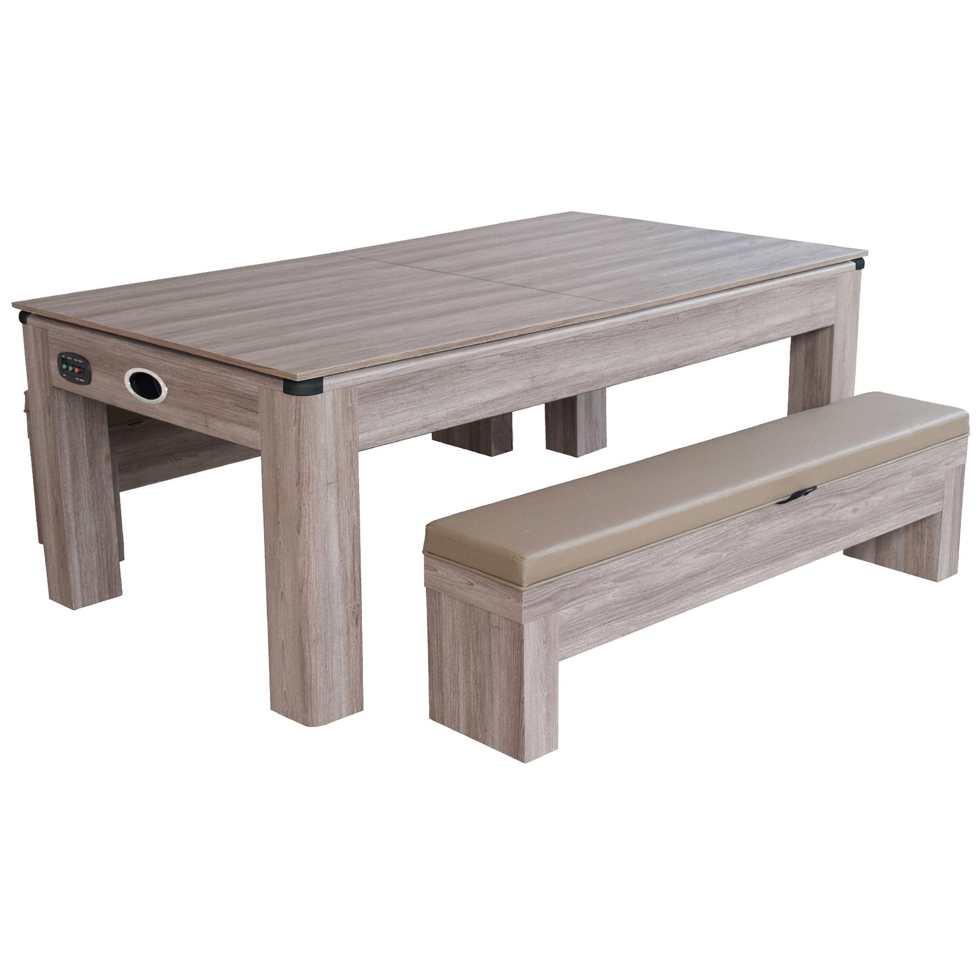 With a High-gloss, poly-sealed, scratch-resistant, high-speed playing surface your puck or ball will glide effortlessly, on this stylish Hathaway 3 in 1 game table. Crafted from a CARB-certified beautiful MDF material covered with stylish and durable Driftwood melamine, this table is extremely sturdy and reliable, coming in a unique style. Additionally, with your purchase of this table, you receive two luxuriously soft padded bench seats, which double up as storage for all of your incredible free accessories, which feature hinges with easy to open hydraulic EZ- lifters. Simply lift the tabletop and place it on top when you wish to embrace the dining configuration, allowing you to avoid the hassle, investment, and space necessary for an additional table to sit, drink and eat at following some game time.