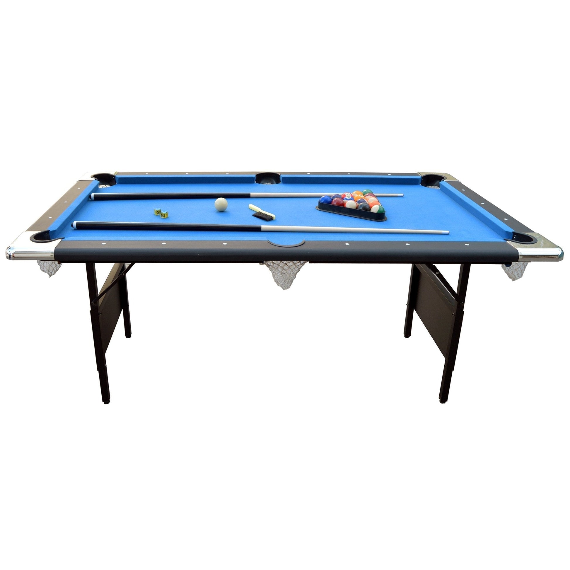 The unique Fairmont 6-ft Pool Table was specifically designed for smaller spaces and portability. But don't let its size fool you! It's packed with many quality features found on much larger, more expensive tables. This table features 5-in wide top rails wrapped in a durable black melamine, fast action cushions, and a "True Roll" play surface covered in a high quality, blended wool cloth. The Fairmont is fully supported by strong metal folding legs with levelers that are super easy to set up and even easier to store. This table is certain to provide hours of fun and competitive play for both children and adults alike. Includes a convenient nylon rip-resistant carry/storage bag and all pool table accessories needed to play a competitive game of pool. 180-day limited warranty.