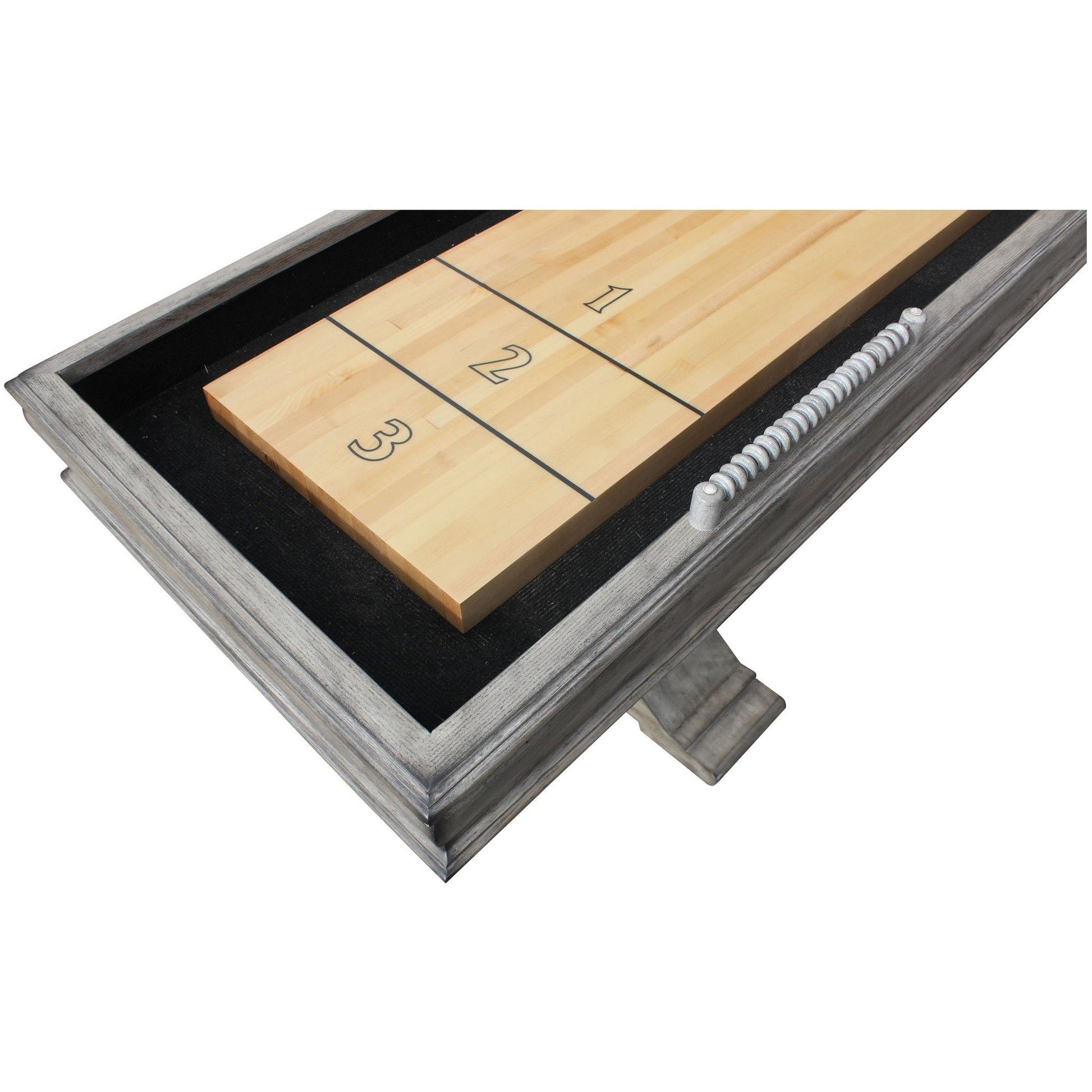 Sculpted, detailed, dual pedestal with interlocking support beams hold this table up with ease, stability and support. The driftwood finish makes this shuffleboard table a perfect fit for a game room or living area.