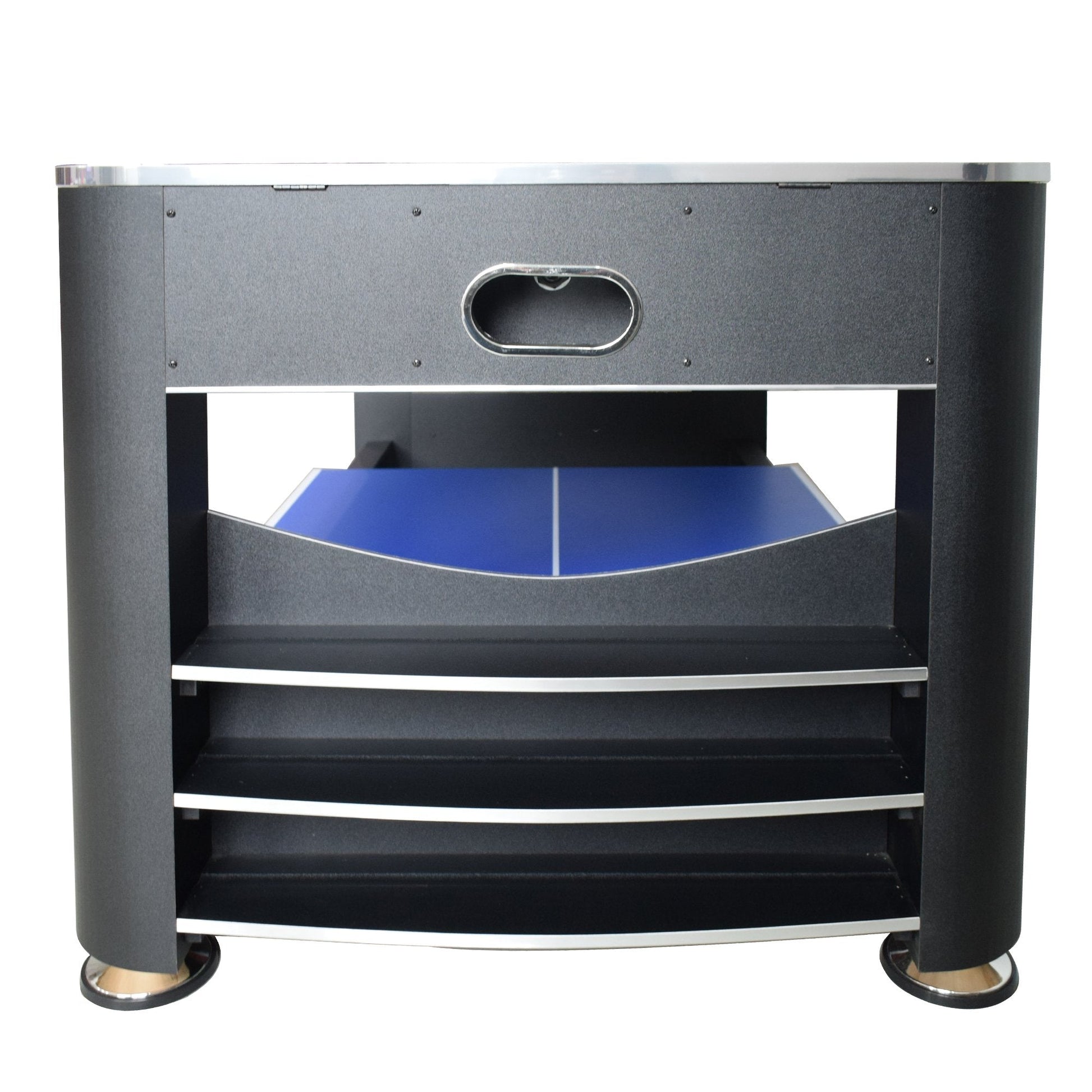 Engineered from quality wood construction, this table features leg levelers that ensures an even playing surface while standing its own against tough, competitive players. Converting between games is easy and convenient. Simply rotate the table and lock into place to change between billiards and air hockey. Table tennis comes as a removable top.