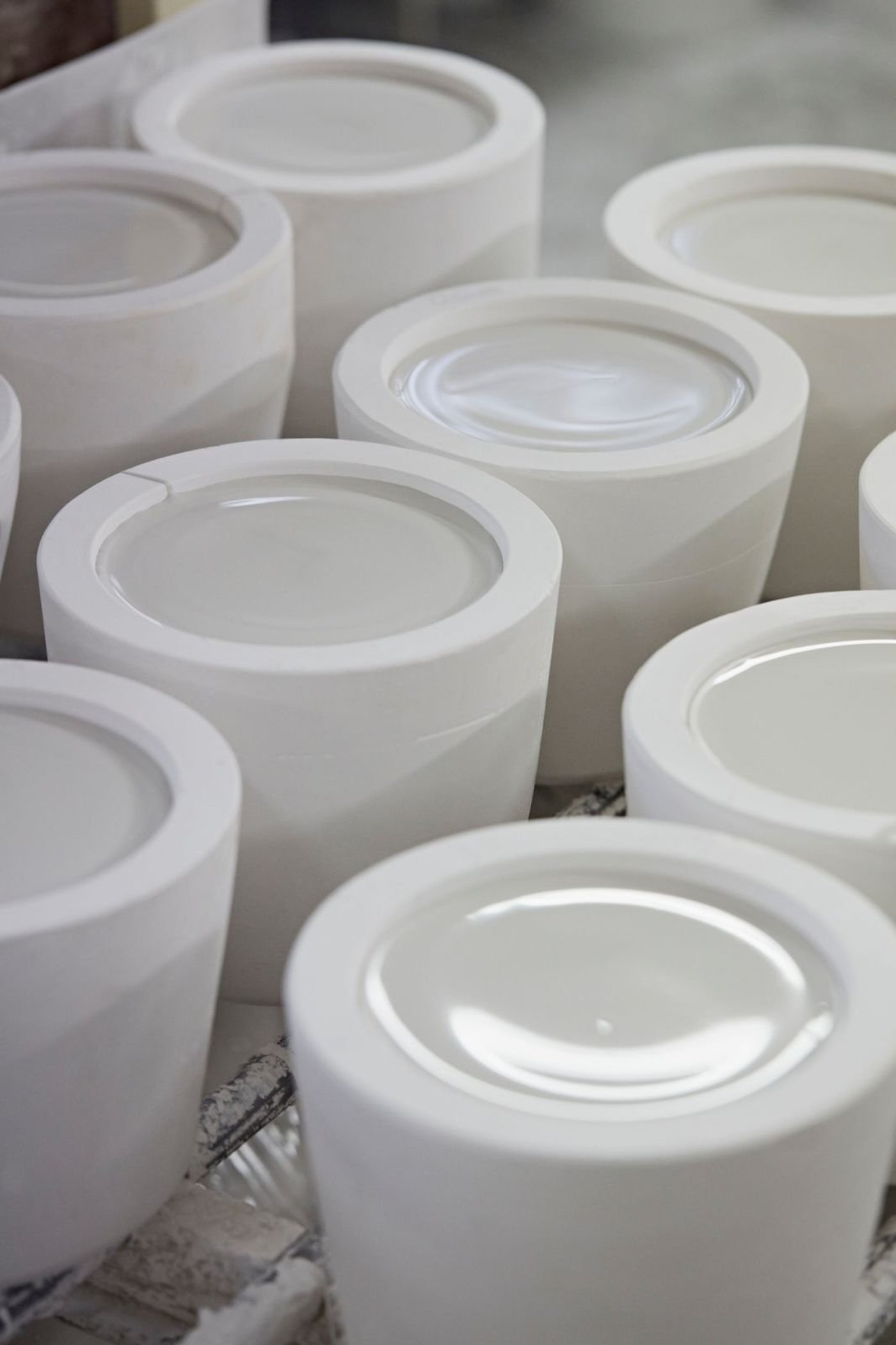 A: Crafted from translucent bone china with chrome or brass fittings and a gray braided fabric cable.