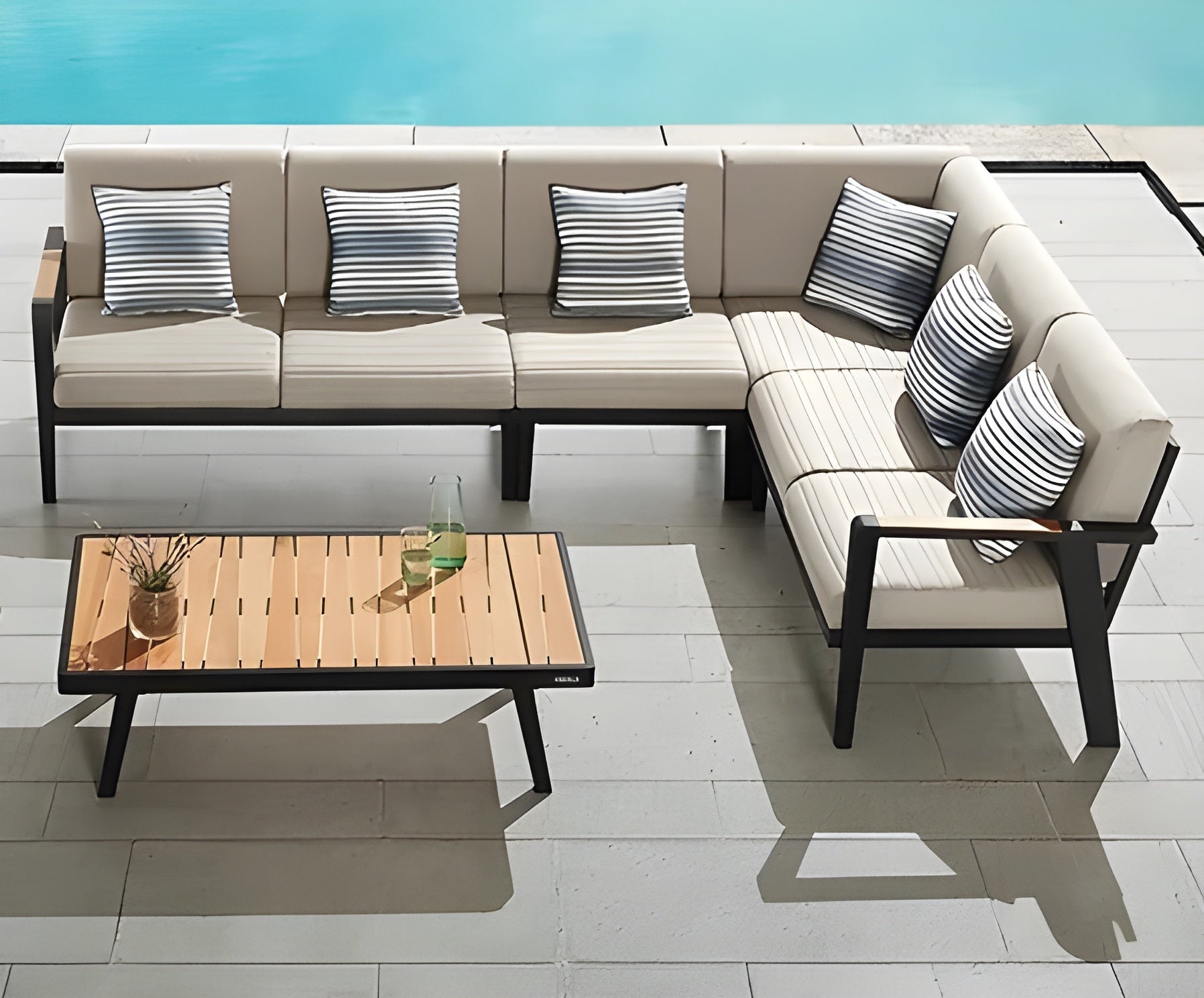 The Emoti sectional set combines sleek styling and clever engineering into one simple and beautiful design. Emoti pieces are comfortable and modern. Available exclusively in the Nero color scheme, every seating and dining piece is paired with HiGOLD’s durable Beige fabric for years of enjoyment. Aluminum and teak construction provides worry-free durability without compromising style.