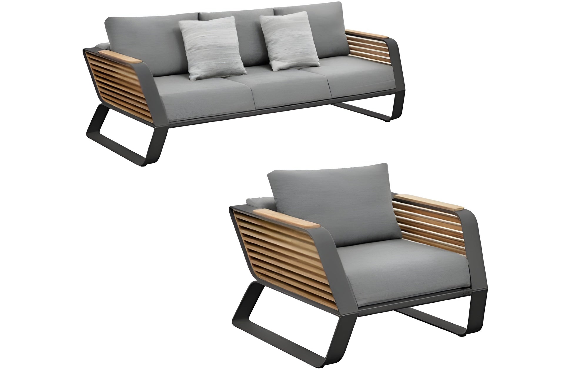 A: The Wing Seating Set – Nero is crafted from weather-resistant fabric, high-density foam for cushioning, and a robust metal or aluminum frame for long-lasting durability.