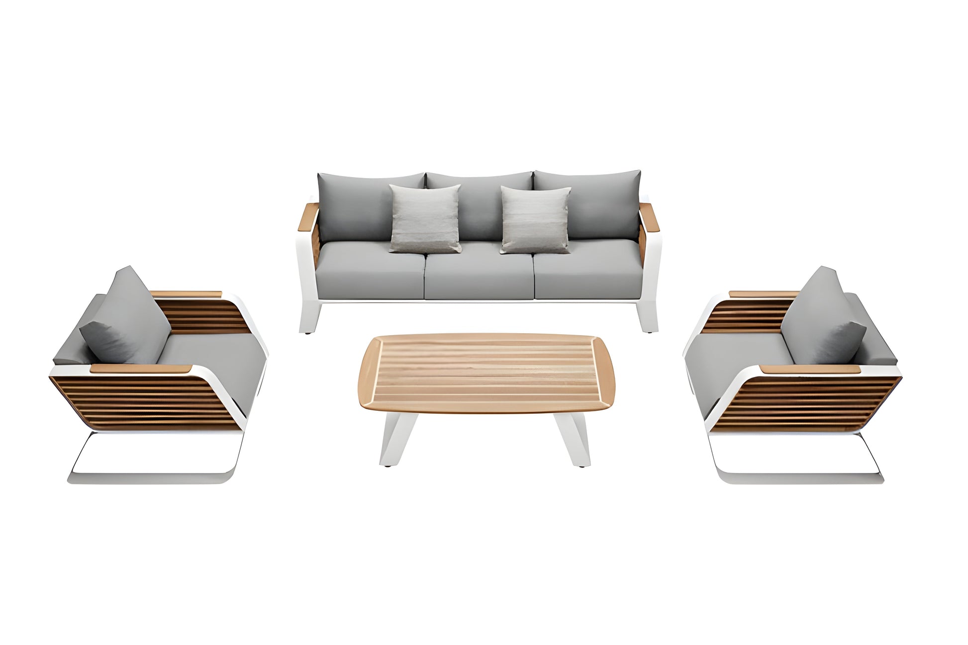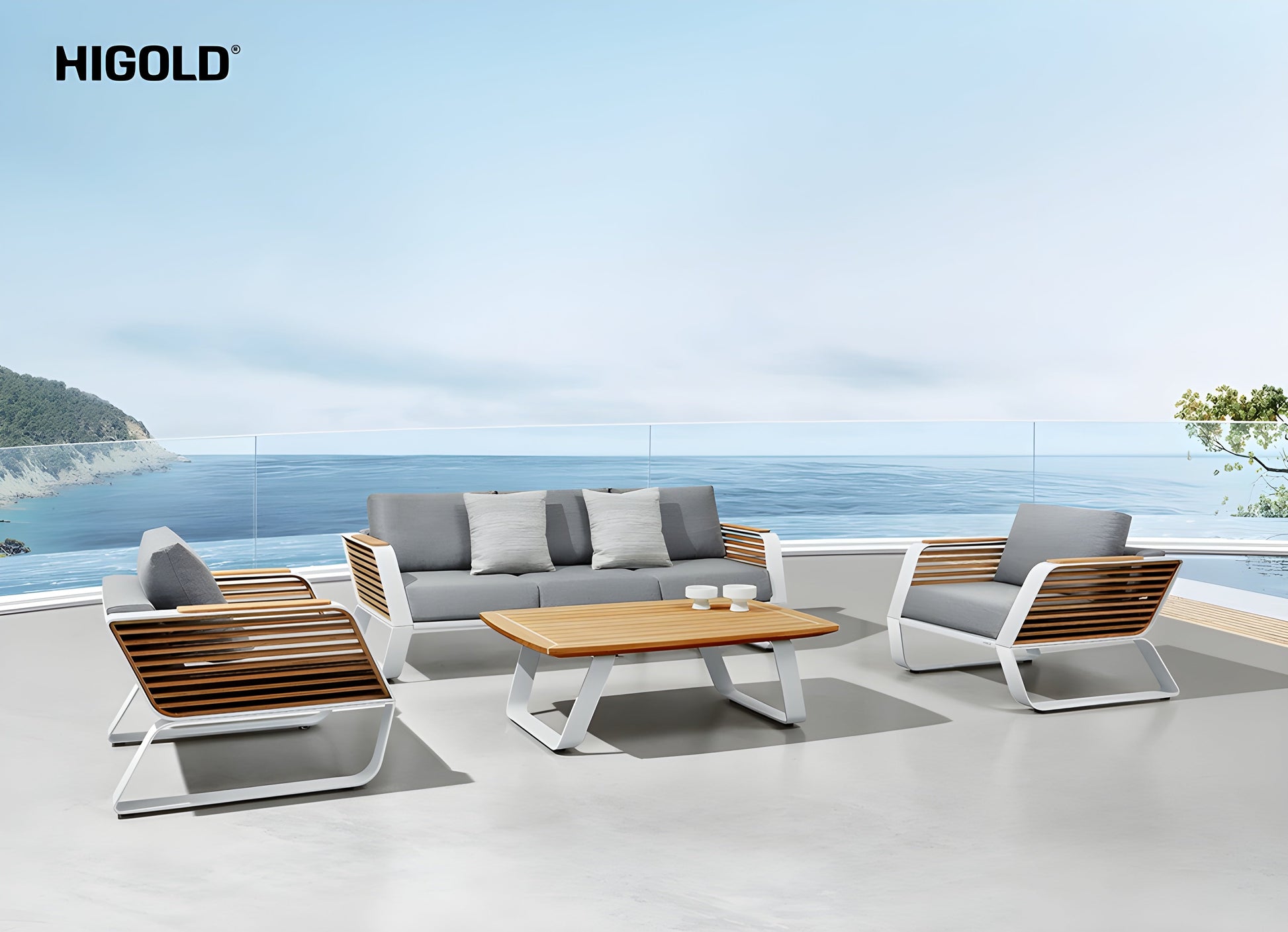 The HiGold Wing collection offers a new and elegant seating set for all to enjoy. Taking inspiration from modern urban structures and sleek aeronautica design, this collection provides an aluminum structure enriched by geometric and essential lines that recall the world of architecture. Featuring the Dura-Firm cushions from HiGOLD and timeless teak slats in the seat arm structure, the Wing collections offers a refreshing seating or dining experience.