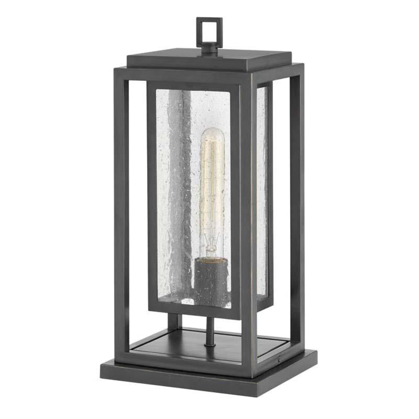 A: The fixture features a durable oil-rubbed bronze (OZ) finish with clear seedy glass, offering a modern, weather-resistant design suitable for outdoor use.