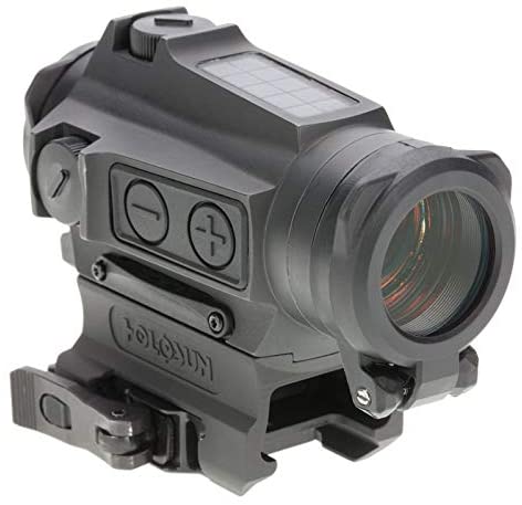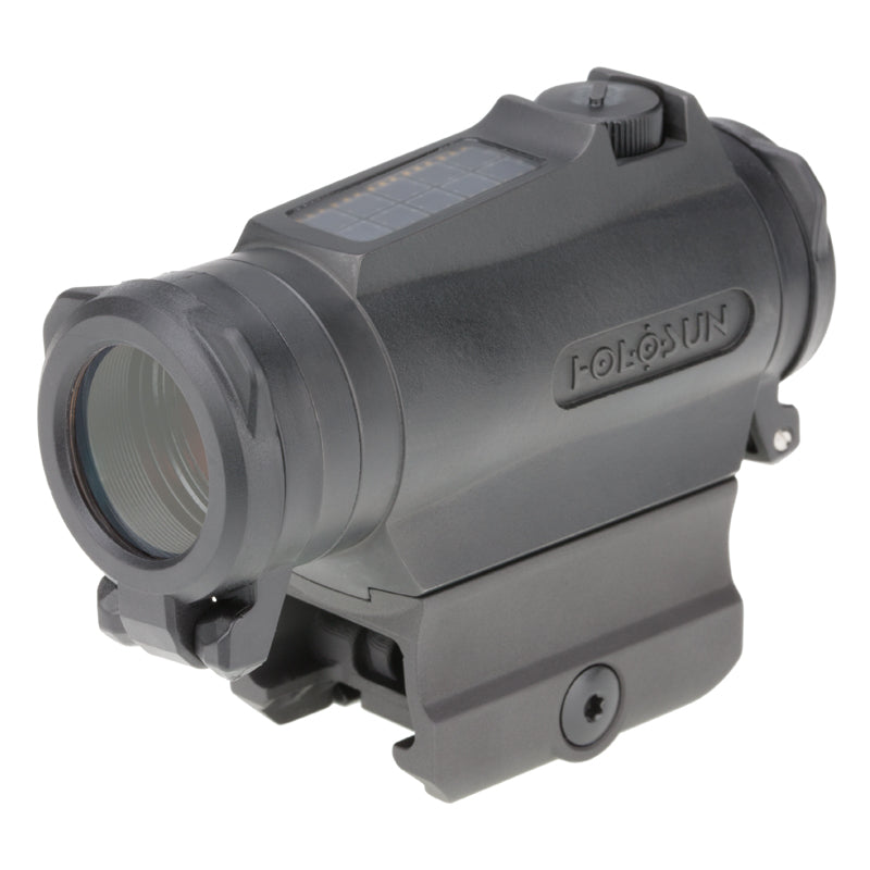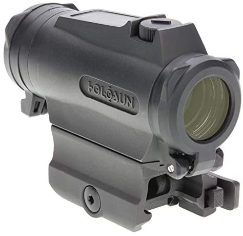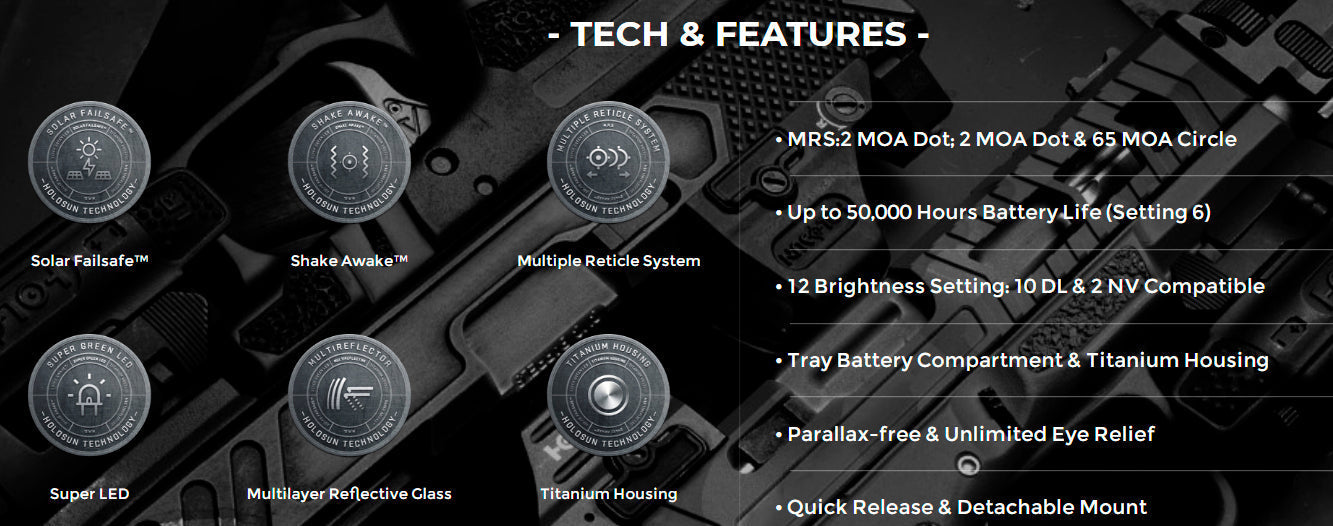 Features include a Titanium Housing, Solar Failsafe, Shake Awake, 12 brightness settings, Holosun’s Super LED with up to 50k hours battery life, Multi-Reticle System and Clear Lens Caps.