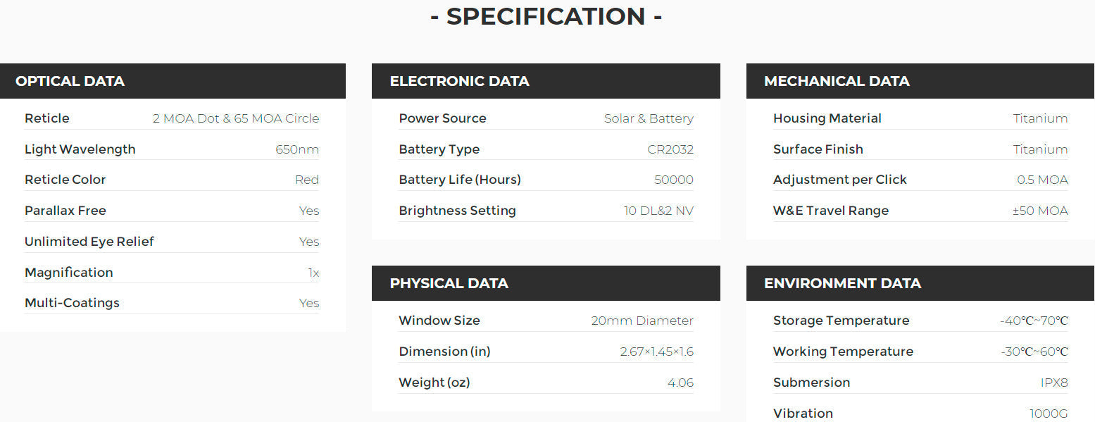 - Reticle: 2 MOA Dot & 65 MOA Circle