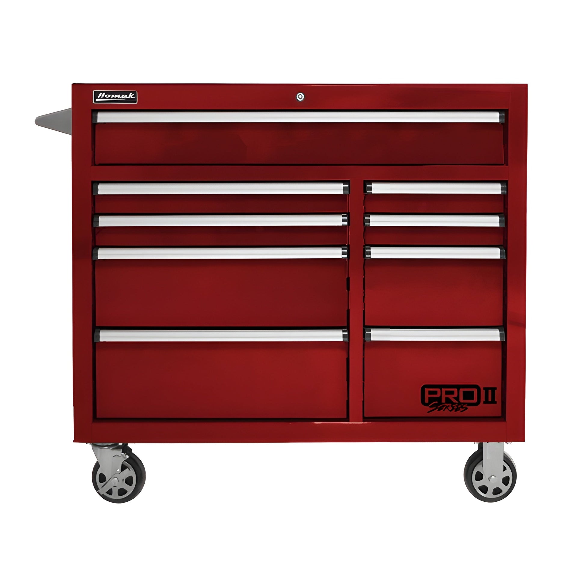 Q: What is the size of the Homak 41” Pro II Series 9 Drawer Roller Cabinet?