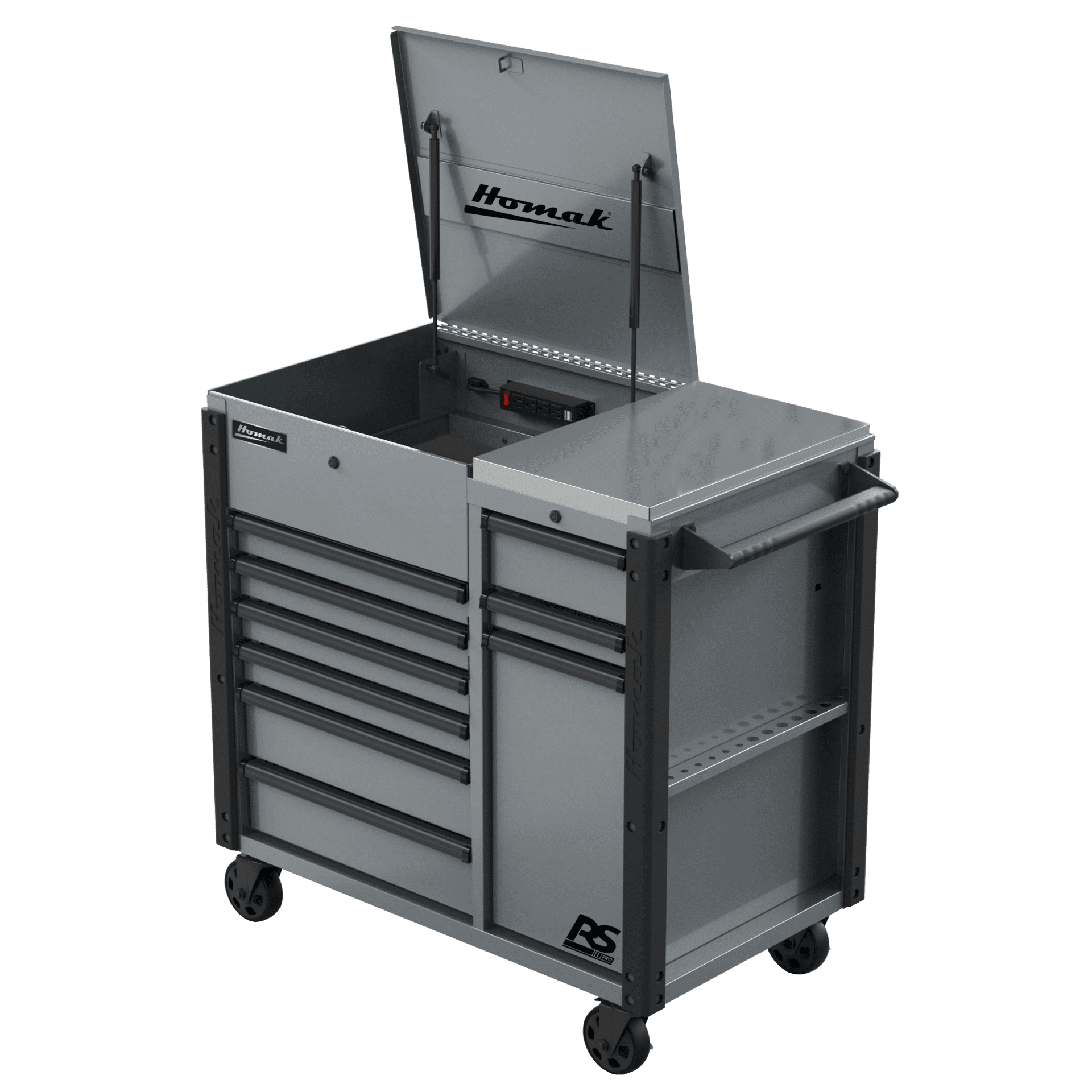 The Homak 44-inch RS Pro 9 Drawer Power Service Cart boasts an electric-powered tool drawer with slotted slides, offering efficient storage, organization, and charging of power tools in a single location. Its top till features a lockable security compartment and an additional electric outlet, perfect for storing laptops, phones, or other electronic devices. With a durable stainless-steel workspace, it ensures longevity and reliability. Equipped with a heavy-duty rubber-coated steel push handle, the cart allows for easy maneuverability around the shop. The lift latch drawer pulls prevent accidental drawer openings. Each drawer is fully extendable, capable of holding up to 100 lbs., and lined with PVC foam for added protection. Its high gloss UV protective powder coat finish effectively prevents rusting, ensuring sustained durability.
