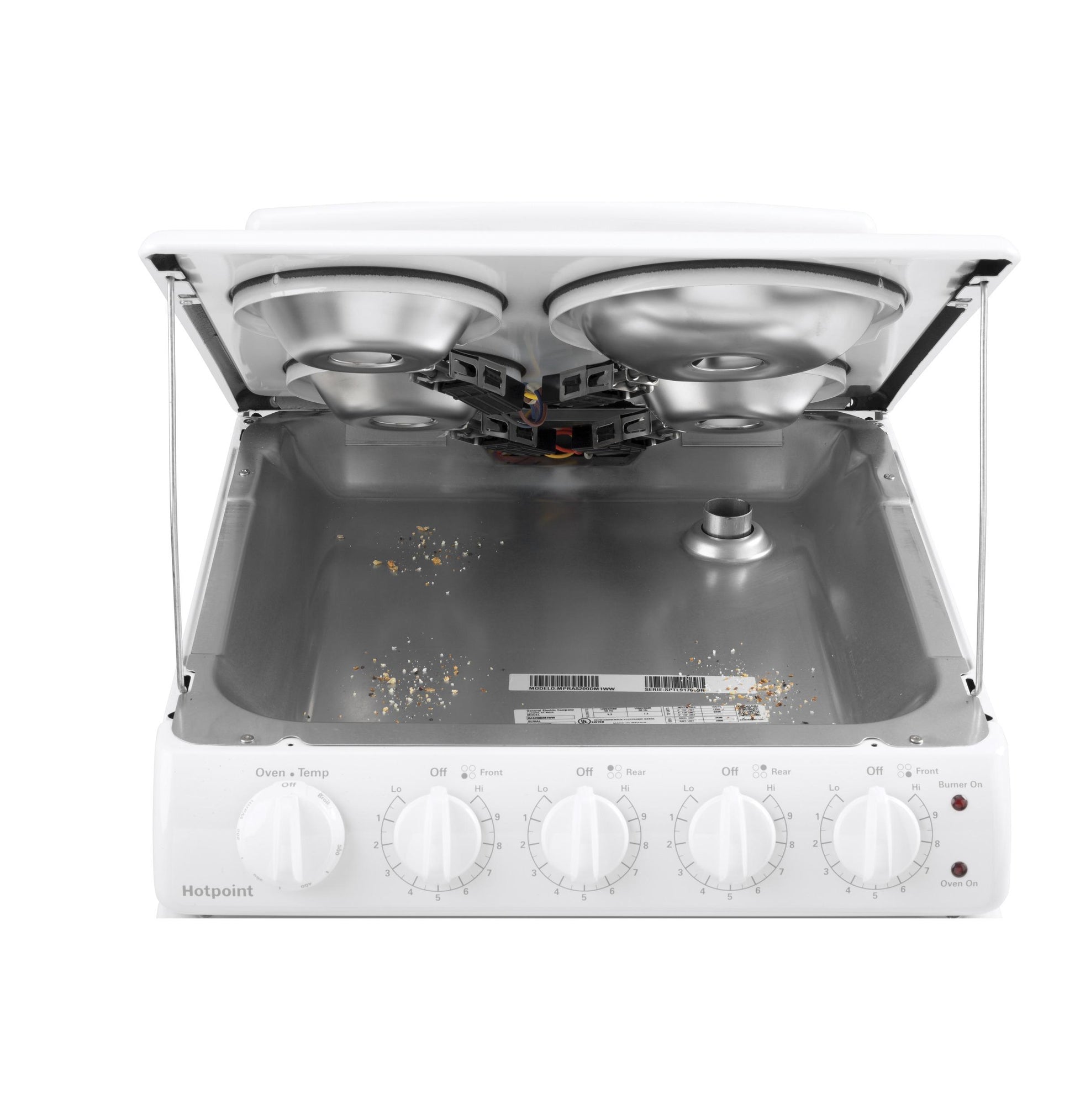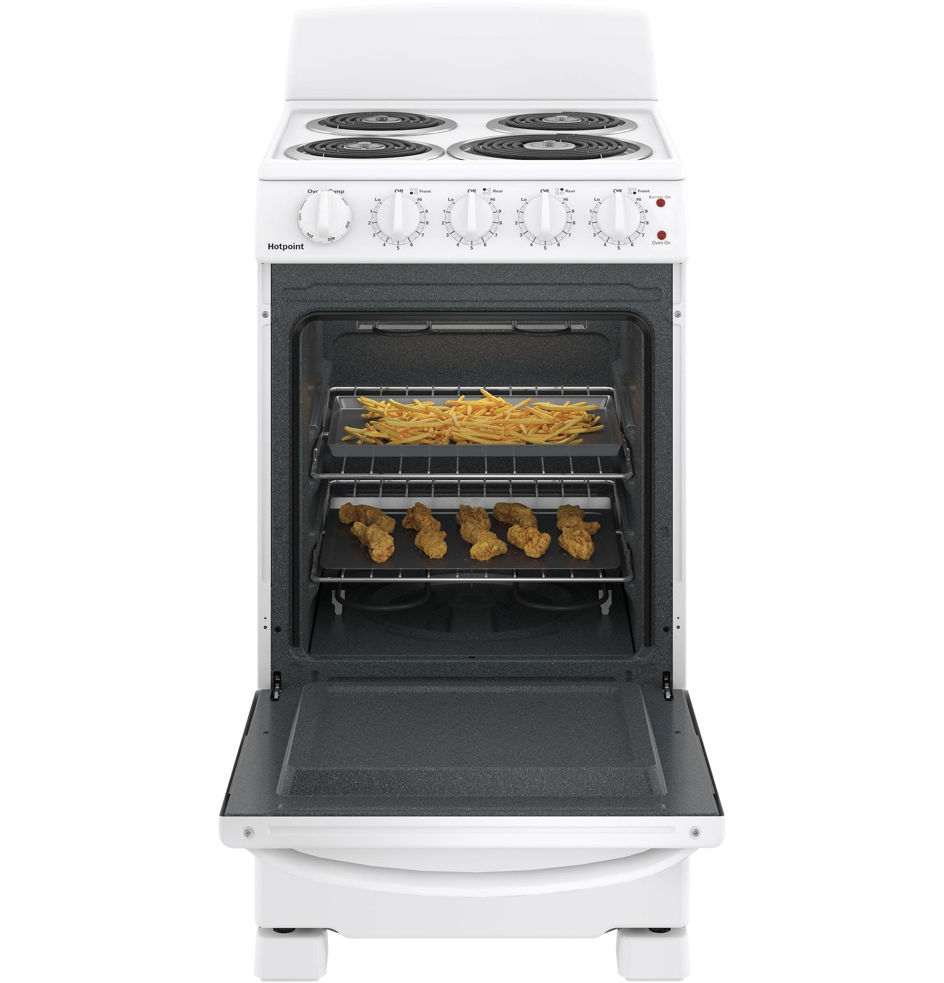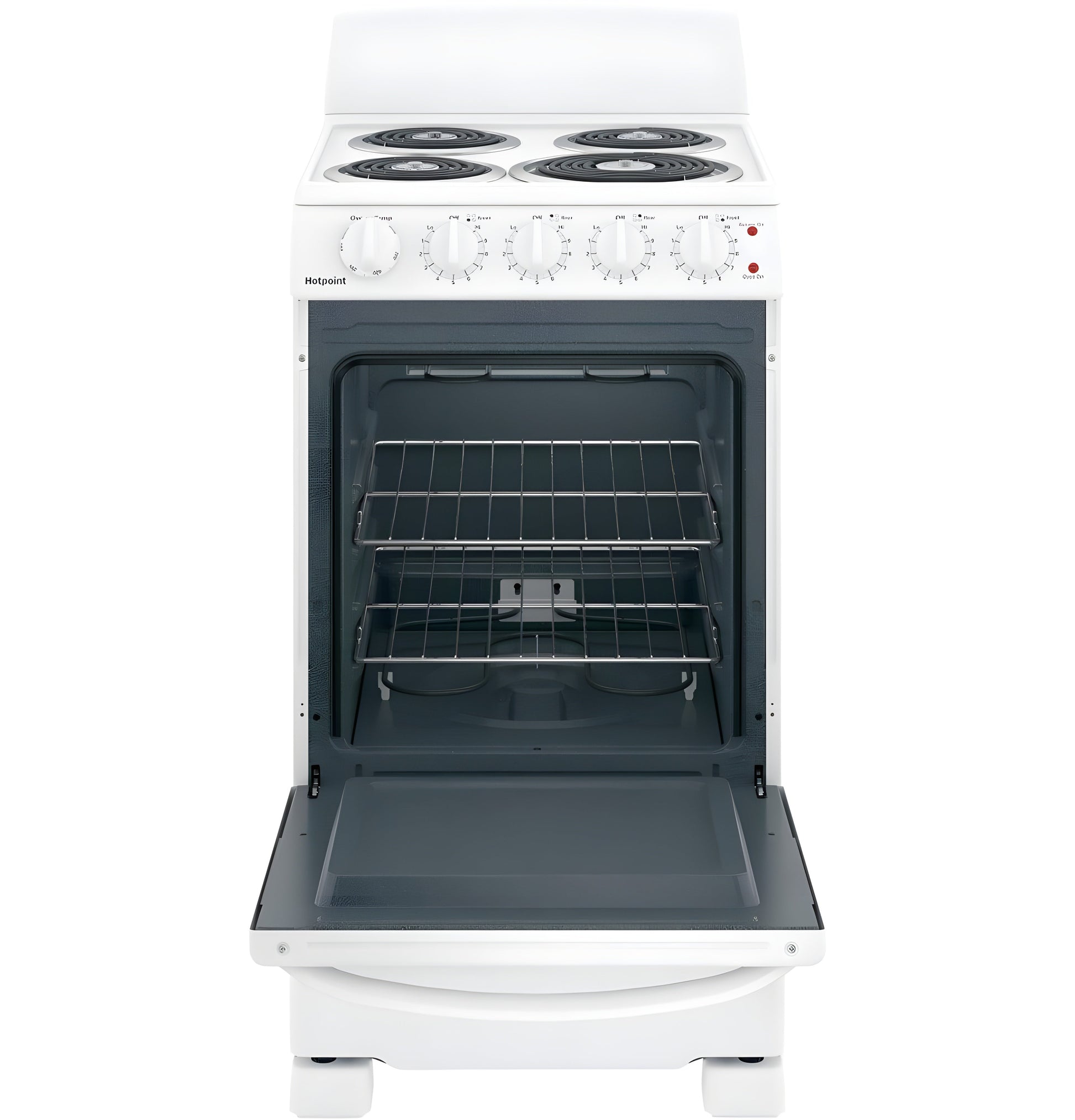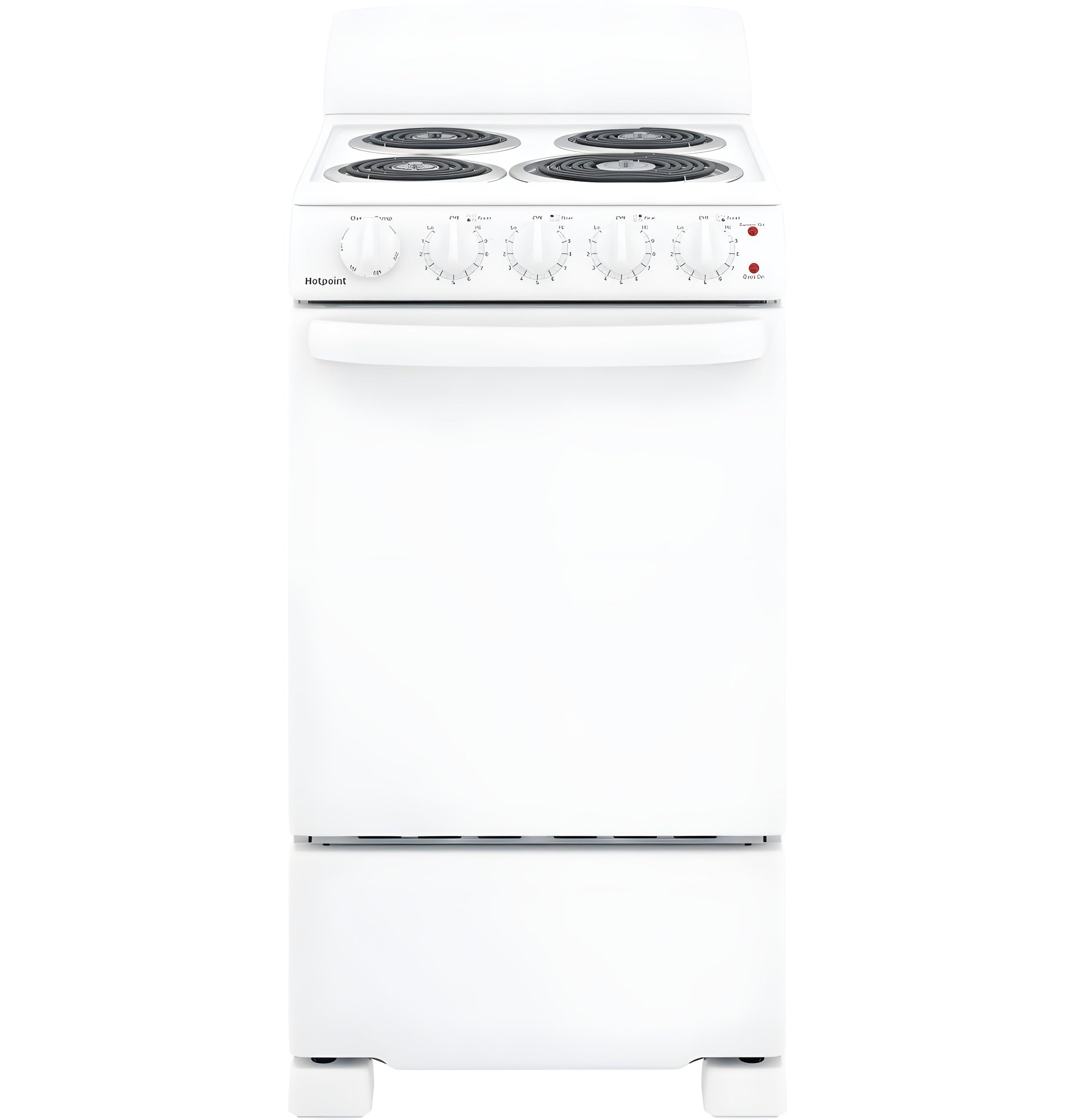 A: The HOTPOINT RAS200DMWW is a 20" electric free-standing range featuring front-control knobs, a standard clean oven, and two coil burners for reliable everyday cooking. It comes in a white finish, offering a classic and compact solution for small kitchens.