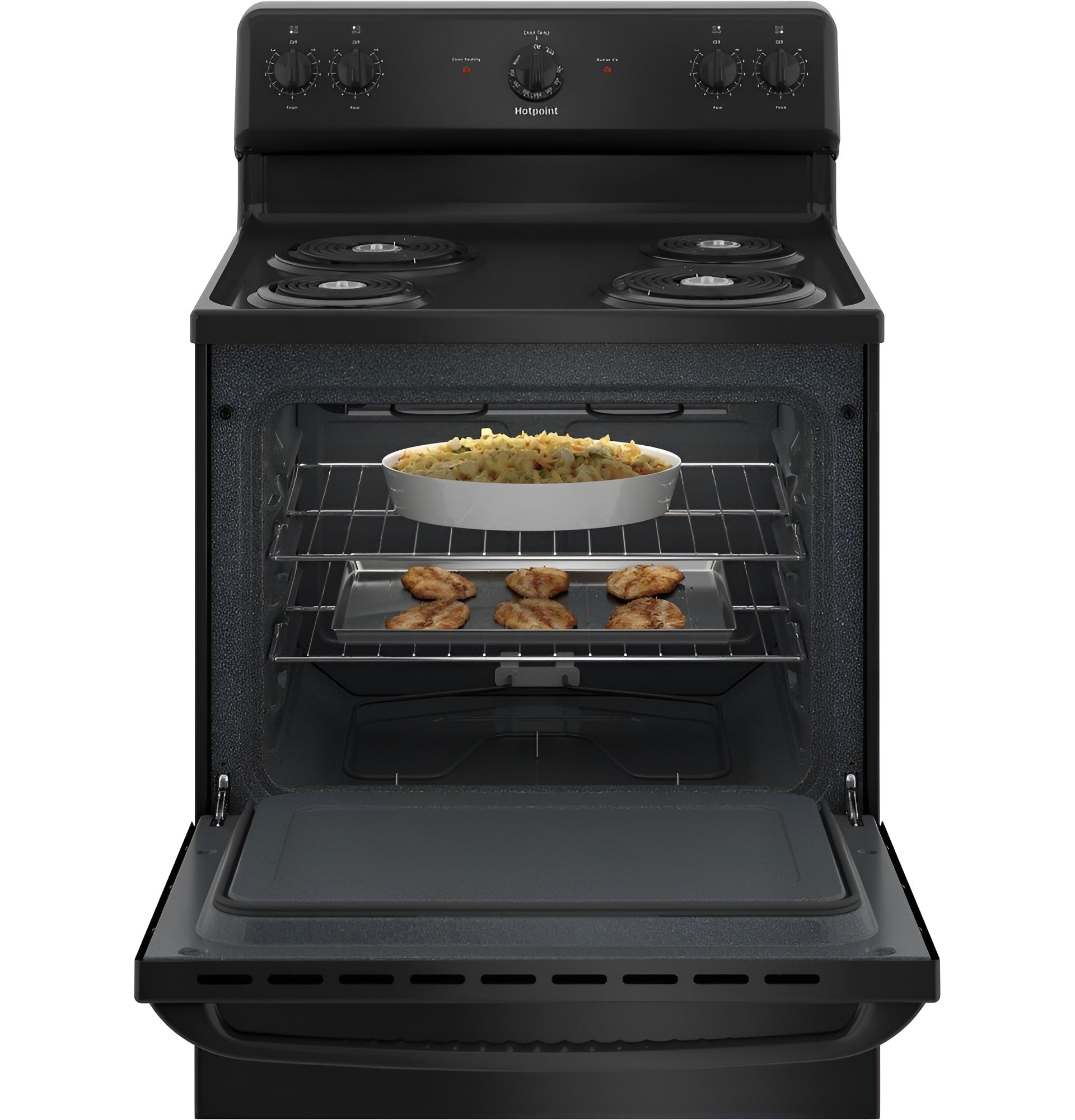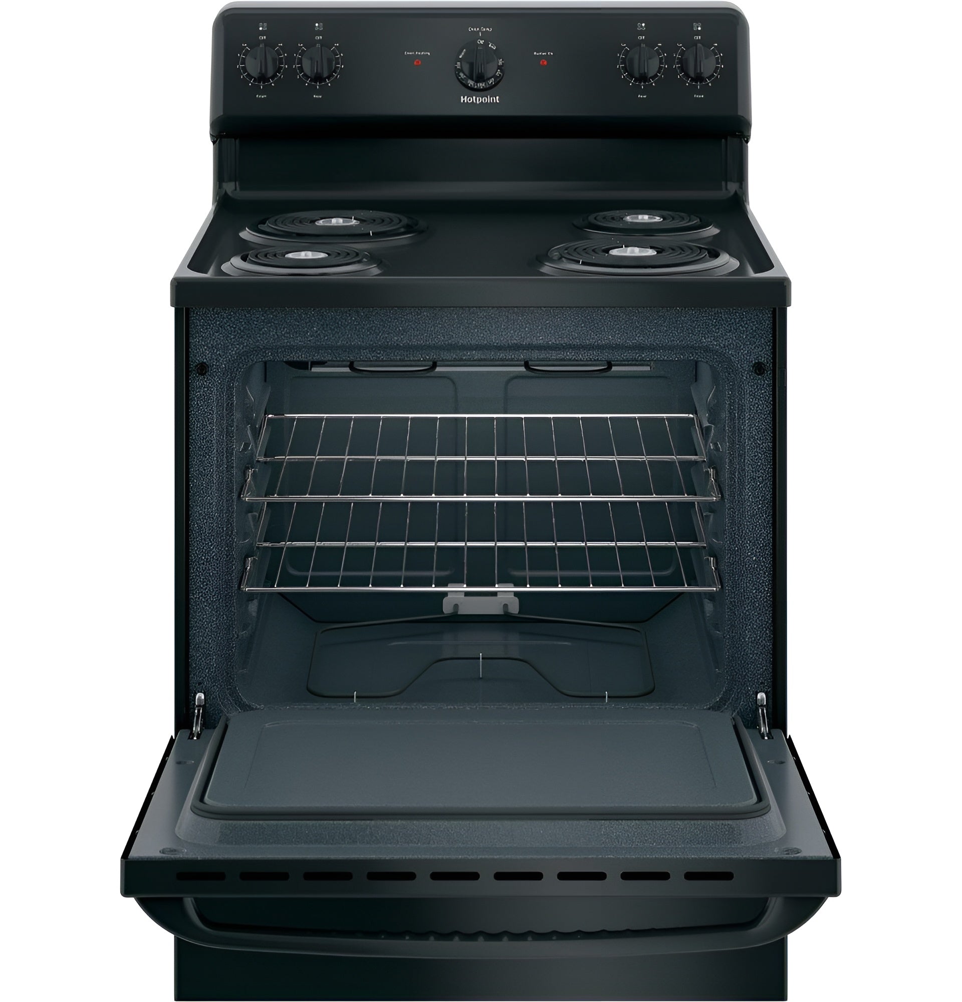 A: The HOTPOINT RBS160DMBB is a 30" free-standing electric range featuring four coil burners, a spacious oven, and a durable black finish. It offers reliable performance with easy-to-use controls and a compact design ideal for any kitchen.