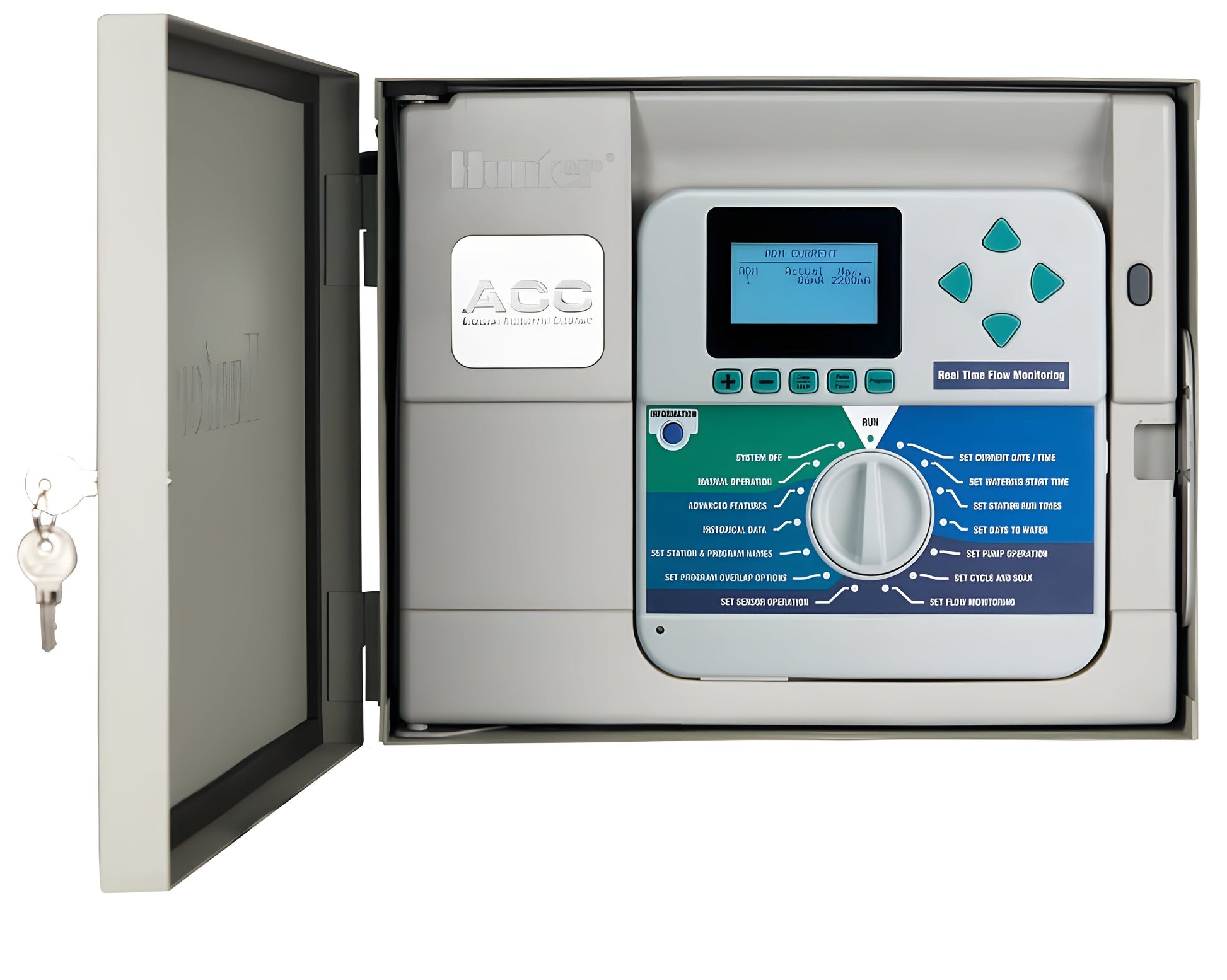 The ACC brings the versatile features of modularity to the most advanced large-scale commercial controller in the Hunter line. The adaptable design not only allows configuration to the number of stations you desire, but it also makes it easy to upgrade to two-way communication with a Hunter Central Control System. What truly sets the ACC apart is its sheer power. Intelligent overlap settings and its powerful transformer allow ACC to run up to 6 programs simultaneously, packing the most watering into the shortest water window.  Real-time flow monitoring allows the controller to dynamically respond to overflow conditions by station, and track system water use. The ACC boasts a total of 6 independent and 4 custom programs and the ability to assist the water manager in conforming to “watering windows.” Plus, the ACC’s large backlit LCD display offers the user a convenient means to personalize on-screen station and program names. ACC also has built-in support for the water-saving Solar Sync sensor.
