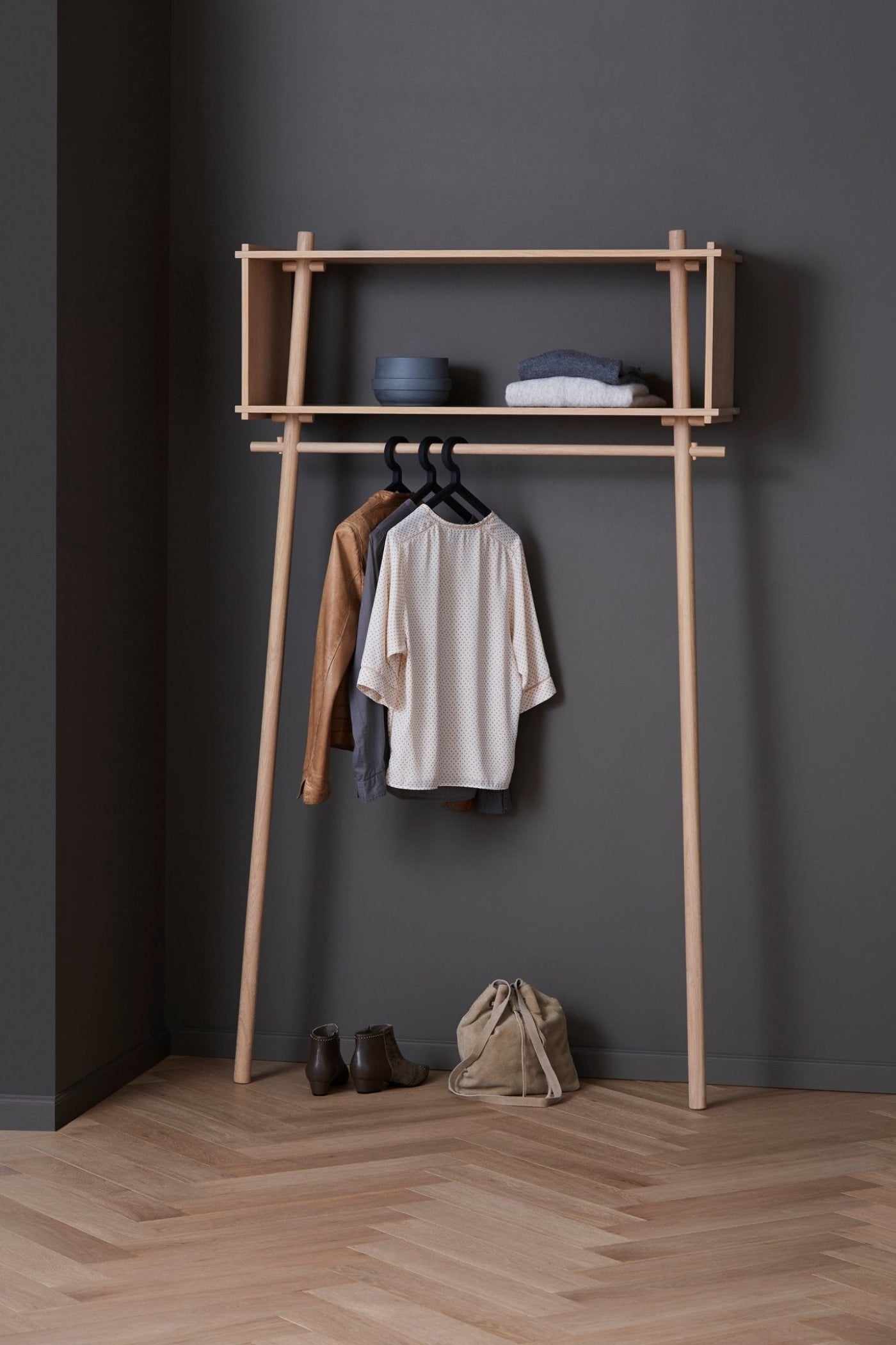 What's really clever about the Illusion design is how it solves the practical problem of closet space while looking like a piece of modern art. When you hang multiple garments using these hangers, they create this rhythmic, diagonal pattern that presents your clothes beautifully instead of the usual crowded mess you get with standard hangers. The angled design means garments don't bunch up against each other as much, so you can actually see what you have and clothes stay less wrinkled. Philip Bro specifically designed them to "tease and challenge your eye" - there's this moment of visual confusion when you first see them that turns into appreciation once you understand how they work. Whether you're using them in a walk-in closet, regular wardrobe, or even on a clothing rack like the O&O from the same brand, they transform functional storage into something that's genuinely interesting to look at. The fact that they come in sets of three means you can create that harmonious grouping effect right away, or mix colors for a more playful approach.