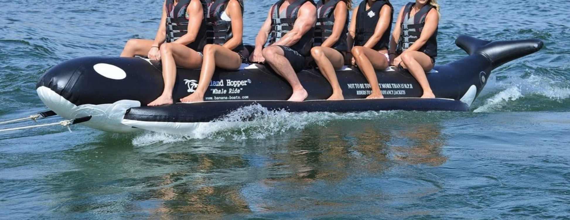 The Island Hopper Inline Recreational WHALE RIDE Banana Boat Water Sleds are Collection of 4-Innovative WHALE RIDE products available exclusively from Island Hopper. The Island Hopper WHALE RIDE Banana Boat Water Sleds are the Perfect-Combination of Durability, Unique-Design and Thrilling Family Fun. The Inline Banana Boat Configuration gives riders that unique gliding banana boat experience that has thrilled families on beaches around the world.Â